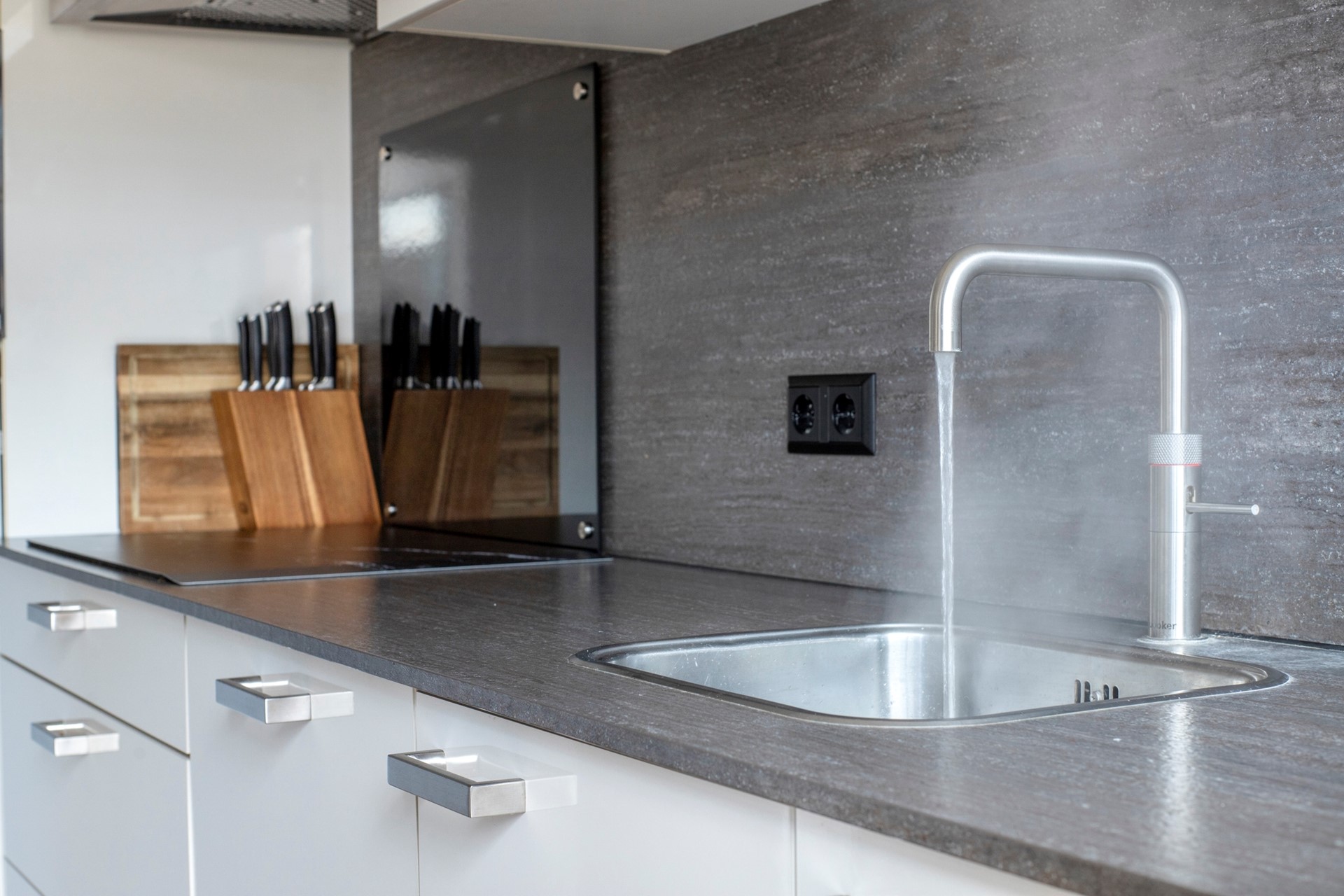 KEUKEN Half open moderne keuken voorzien van de volgende inbouwapparatuur - koelkast - inductie kookplaat - combimagnetron - afzuigkap - vaatwasser - quooker Ook vanuit de keuken is er toegang tot het balkon aan de achterzijde. In een van de kasten is op keurige wijze de opstelling van de combiketel (remeha avanta uit 2016)