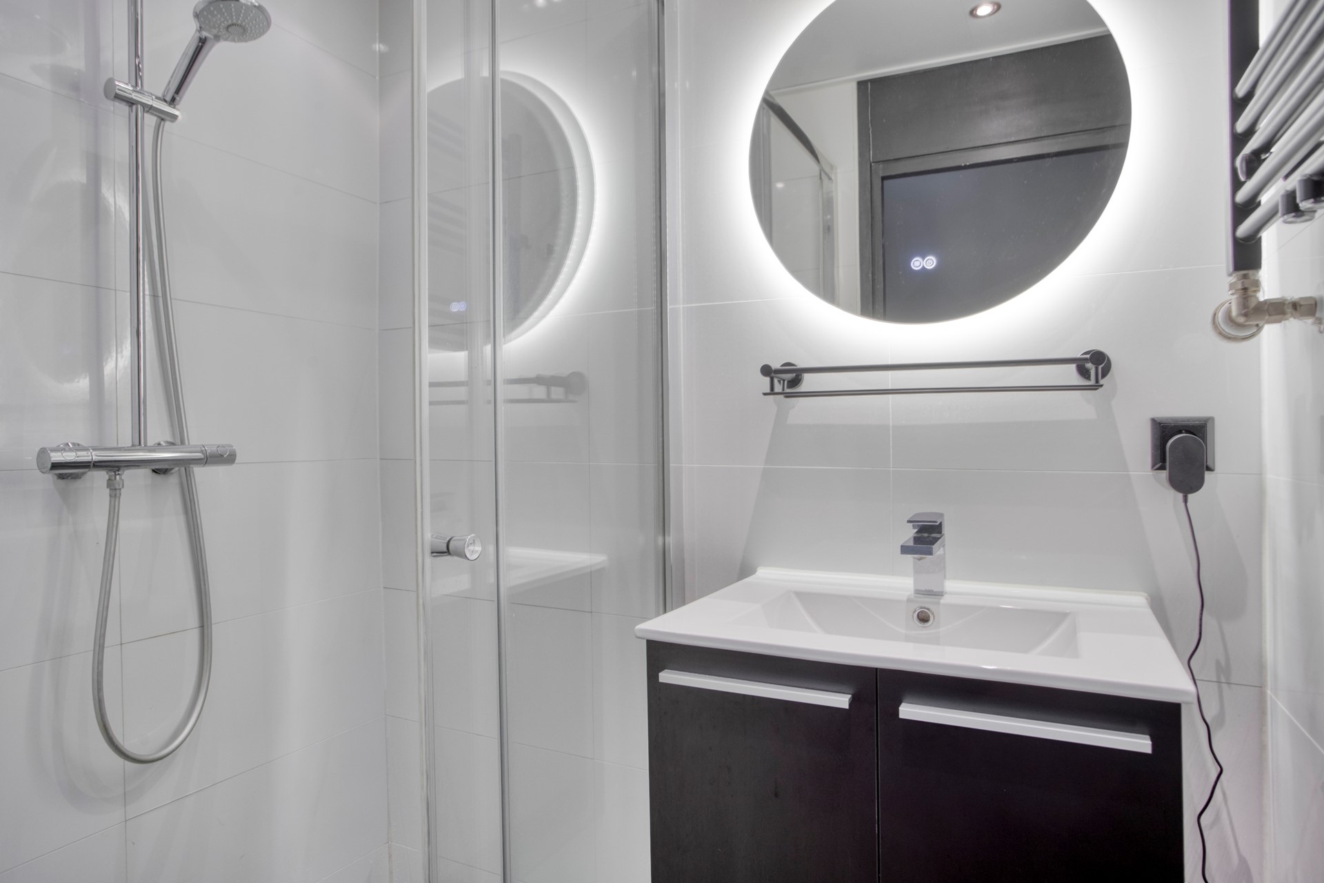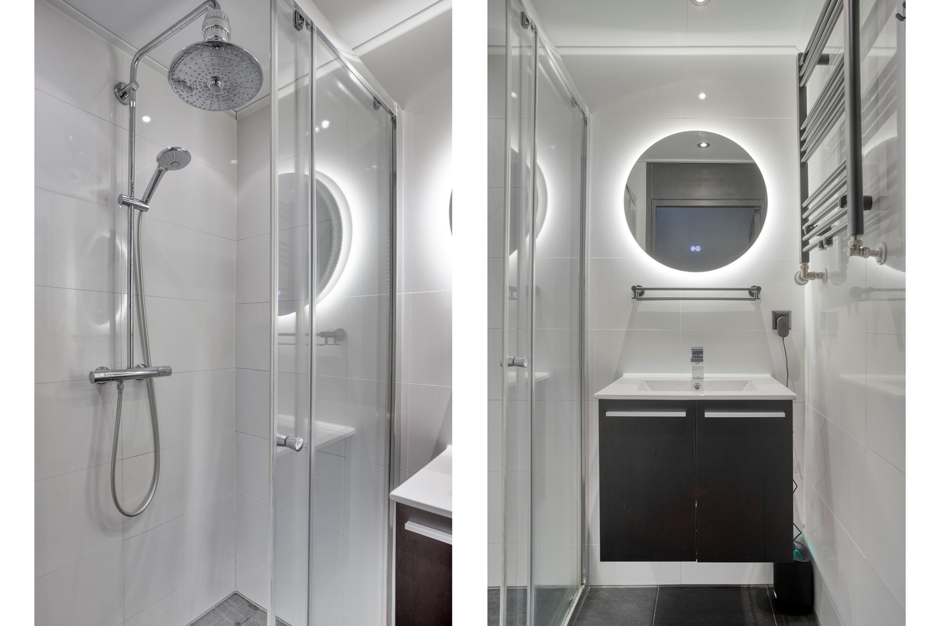 BADKAMER Luxe badkamer met douchecabine vv regendouche, wastafelmeubel, radiator en verwarmde spiegel.