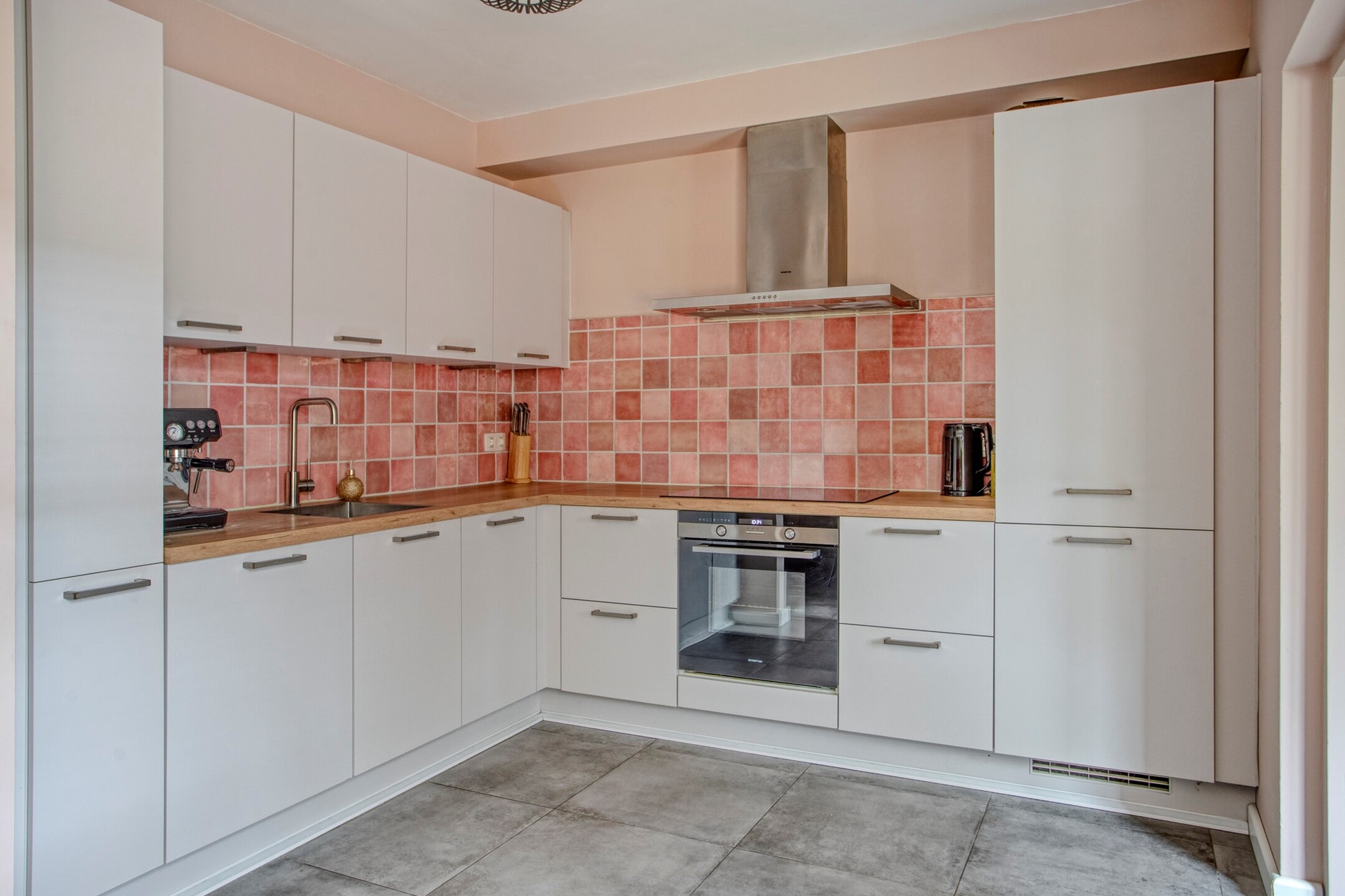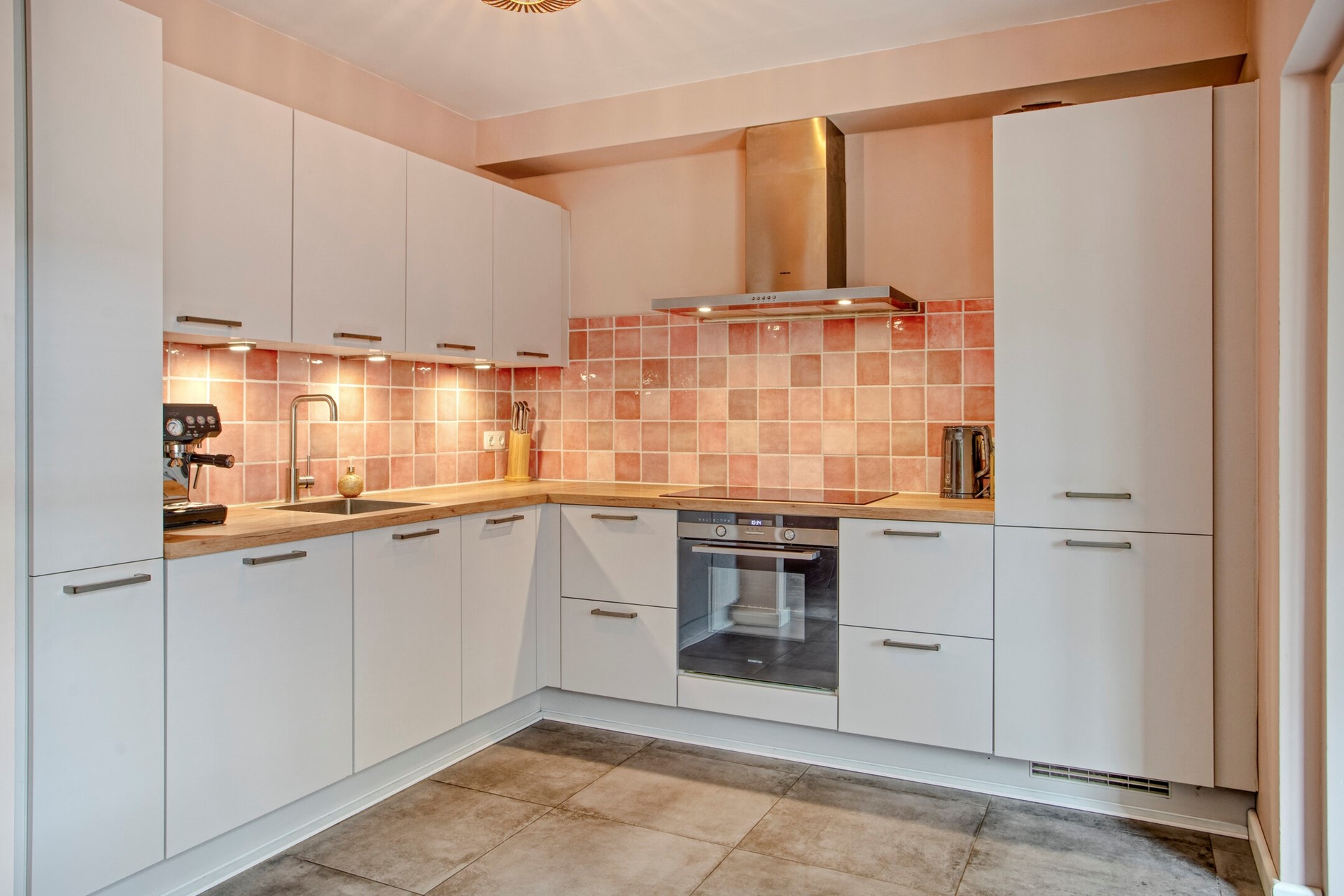 De woonkamer is een echte eyecatcher. Ruim, licht en sfeervol ingericht, met als warm middelpunt de houtkachel. De moderne afwerking en het kleurgebruik geven de ruimte een eigentijdse uitstraling die direct aanspreekt. Aan de achterzijde loopt de ruimte naadloos over in de keuken. Deze is strak uitgevoerd en voorzien van diverse inbouwapparatuur – klaar voor dagelijks gemak. Extra pluspunt: de bijkeuken. Ideaal als extra bergruimte, wasruimte of gewoon als praktische schakel naar de tuin.