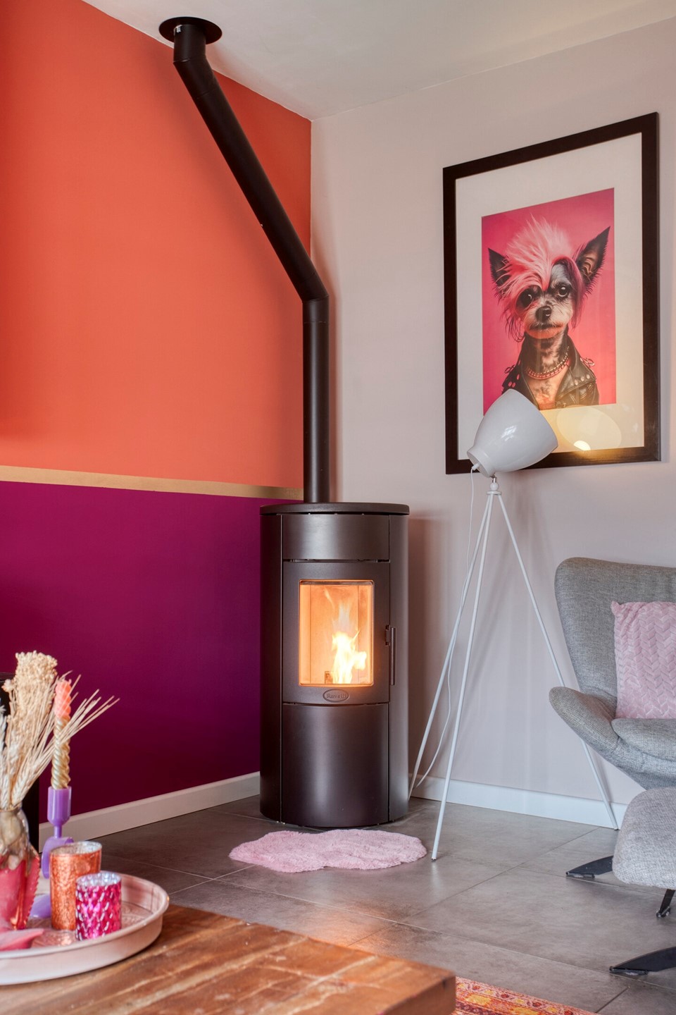 WOONKAMER: Gezellige en smaakvol ingerichte woonkamer met houtkachel en praktische trapkast.