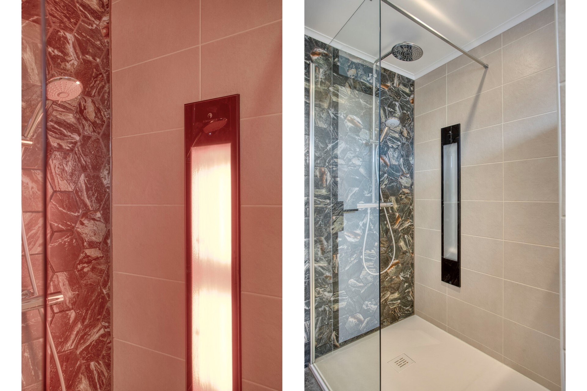 BADKAMER 1: Modern uitgevoerde badkamer met badkamermeubel voorzien van een dubbele wastafel, een grote inloopdouche met een sunshower en een tweede hangend toilet.