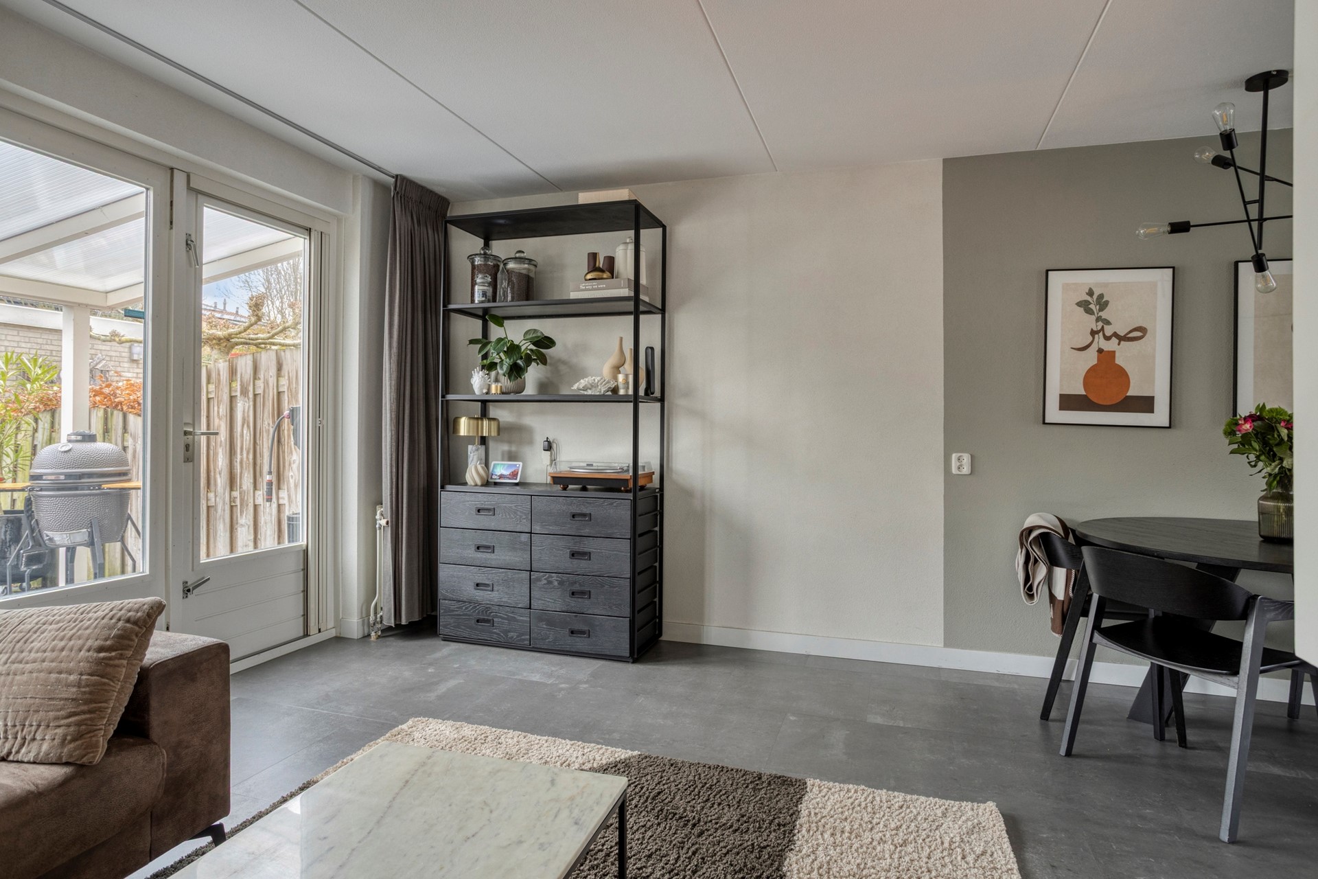 WOONKAMER Tuingerichte woonkamer met gezellige haard (op stoom), deur naar de tuin en laminaatvloerafwerking