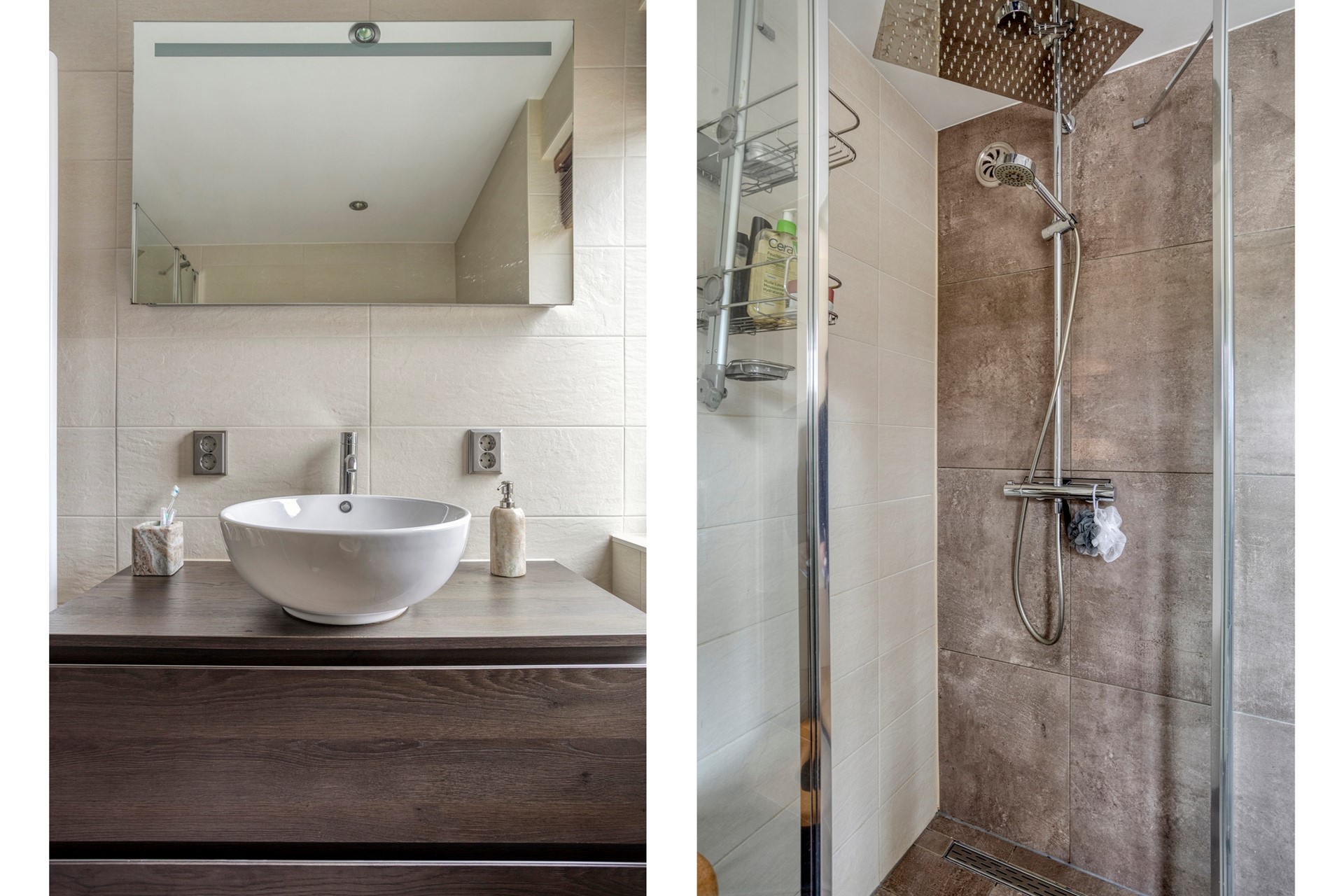BADKAMER Moderne badkamer met douchecabine vv stortdouche, 2e toilet en wastafelmeubel.