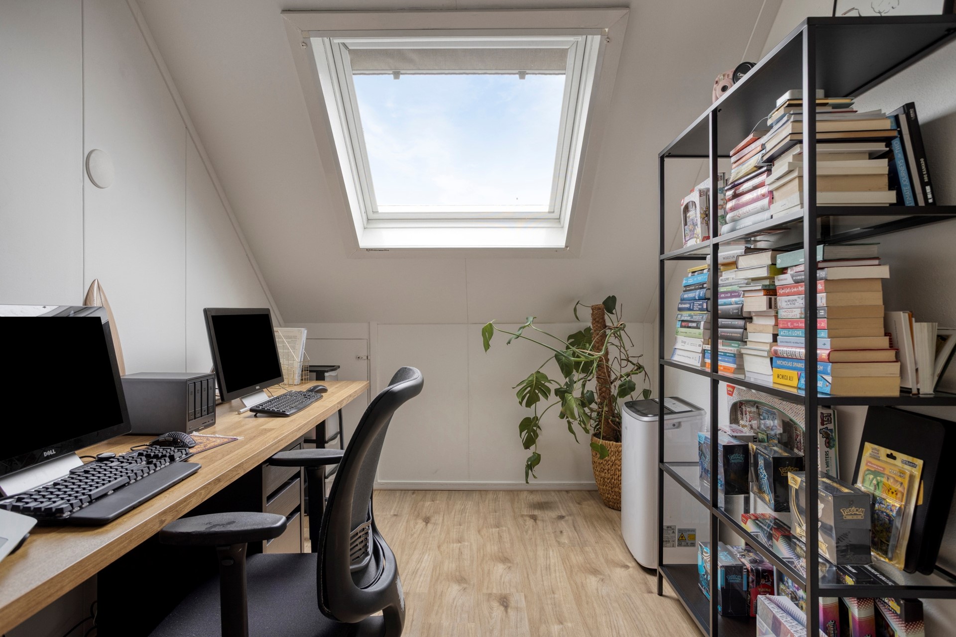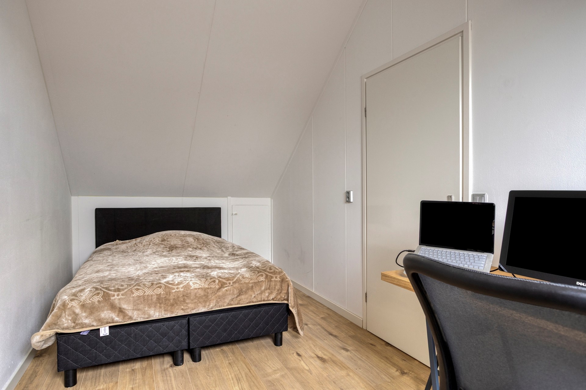 SLAAPKAMER 4 Ruime slaapkamer met laminaatvloer, bergruimte achter de knieschotten en velux dakvenster.