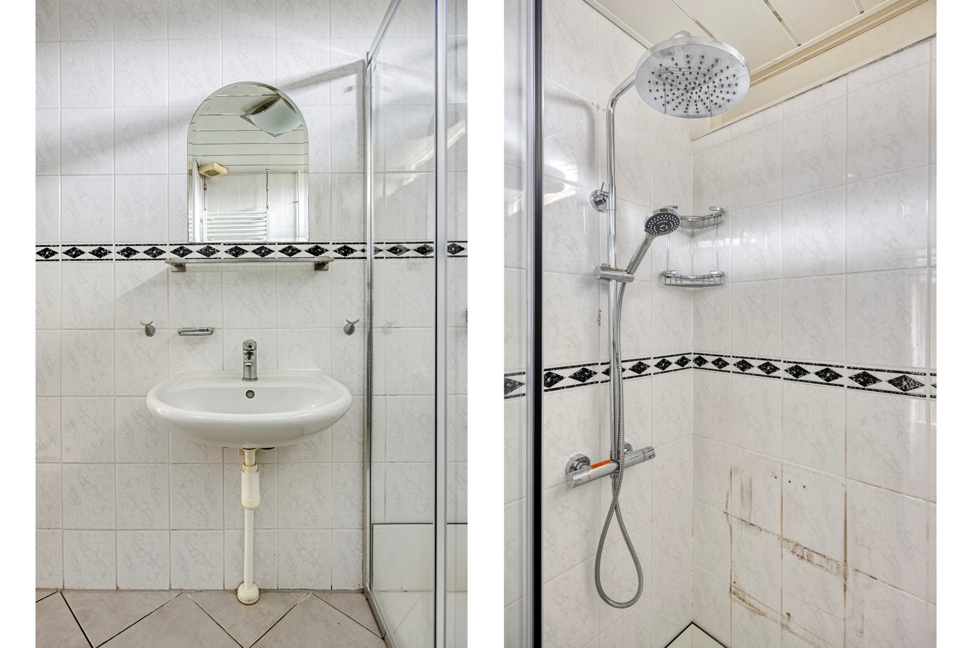 BADKAMER Badkamer met inloopdouche, wastafel en toilet.