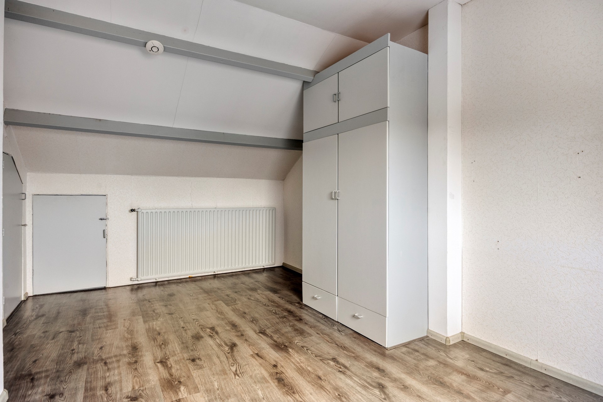 Ruime zolderkamer met knieschotten, bergkast en opstelling van de C.V. ketel (Remeha 2019).