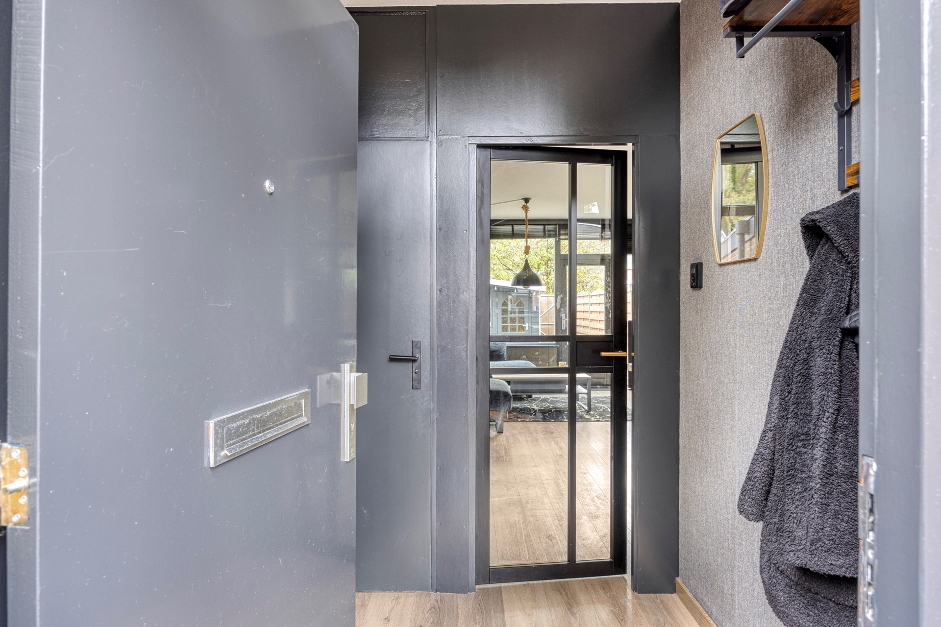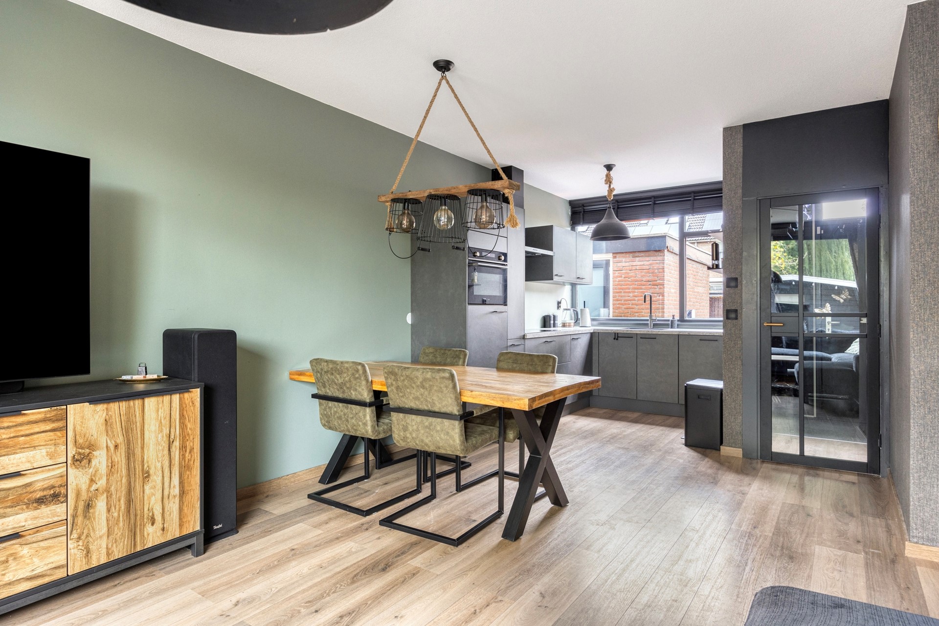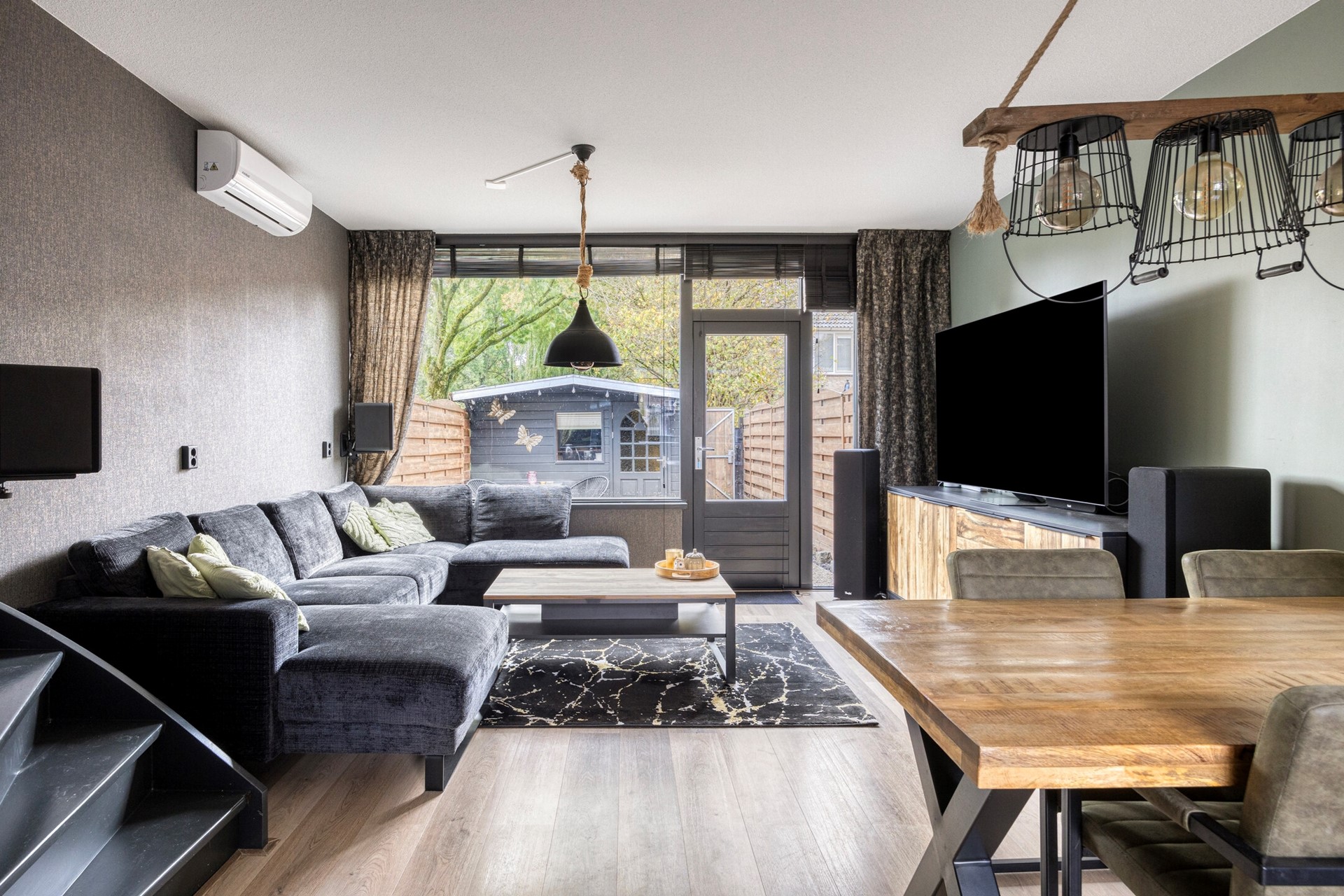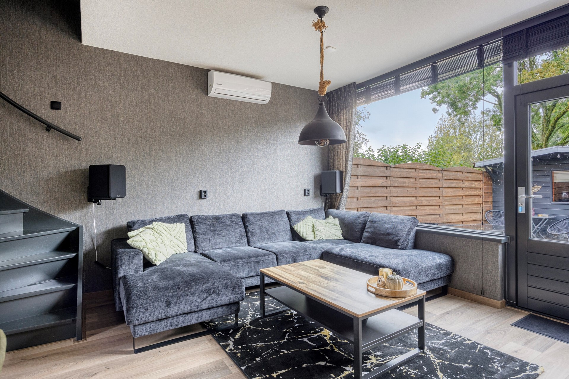 De woonkamer is voorzien van een moderne wand en vloer afwerking; deur naar de tuin en trap naar de verdieping.