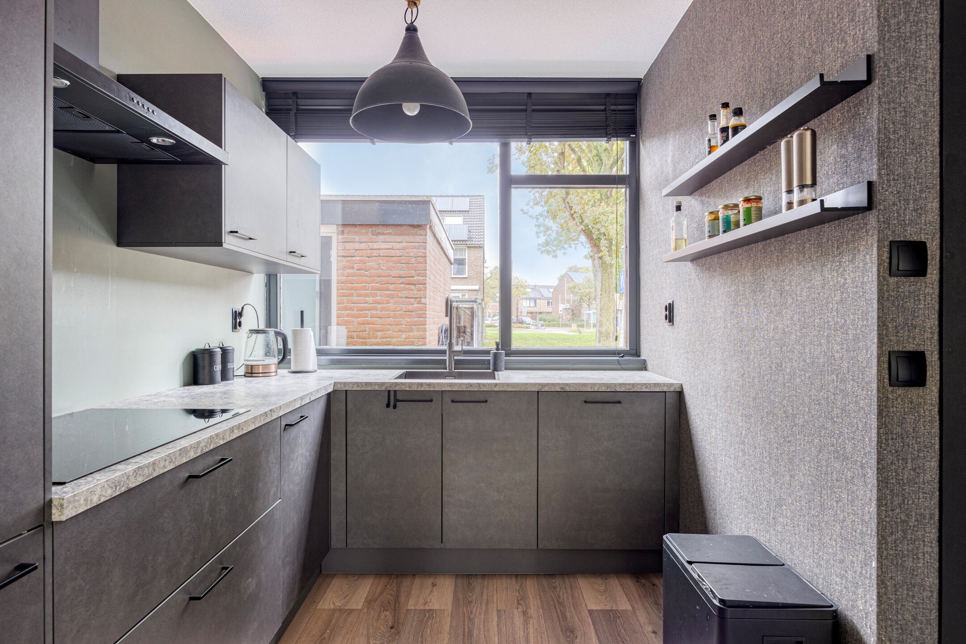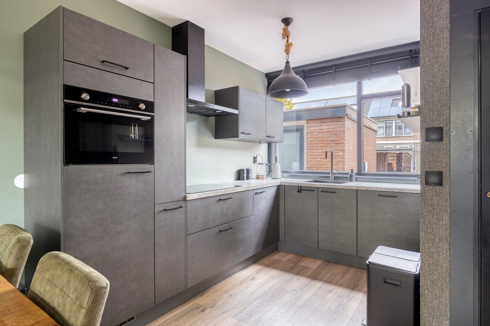 Luxe keuken v.v. inbouwapparatuur (inductiekookplaat, combi oven, vaatwasser, koelkast, afzuigkap).