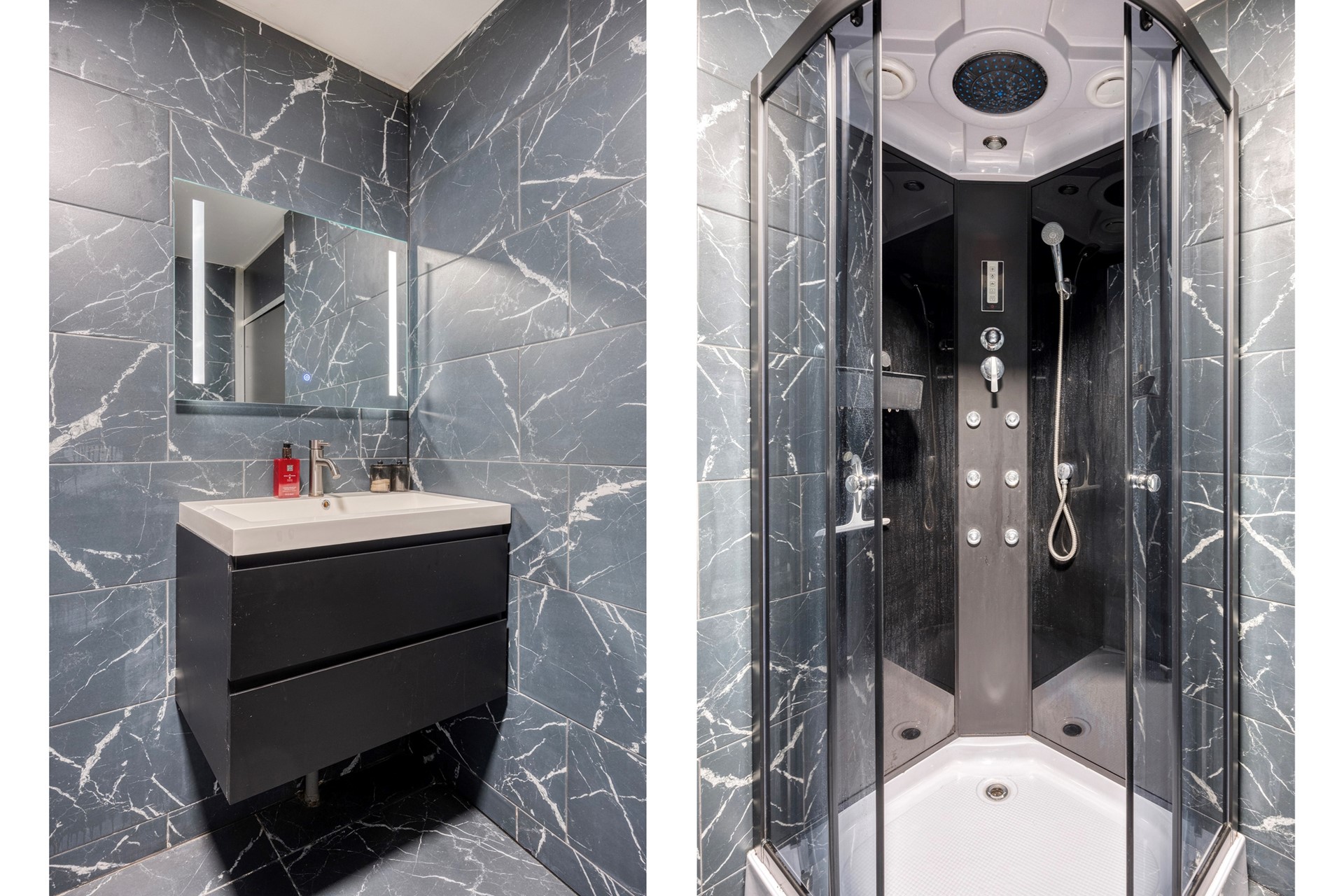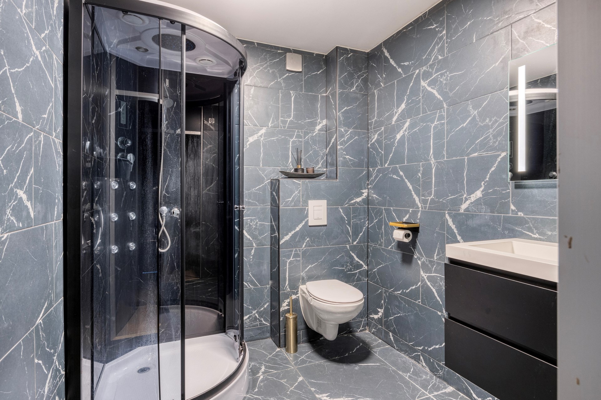 Moderne badkamer v.v. douchecabine met jetstream, wastafel meubel en toilet.