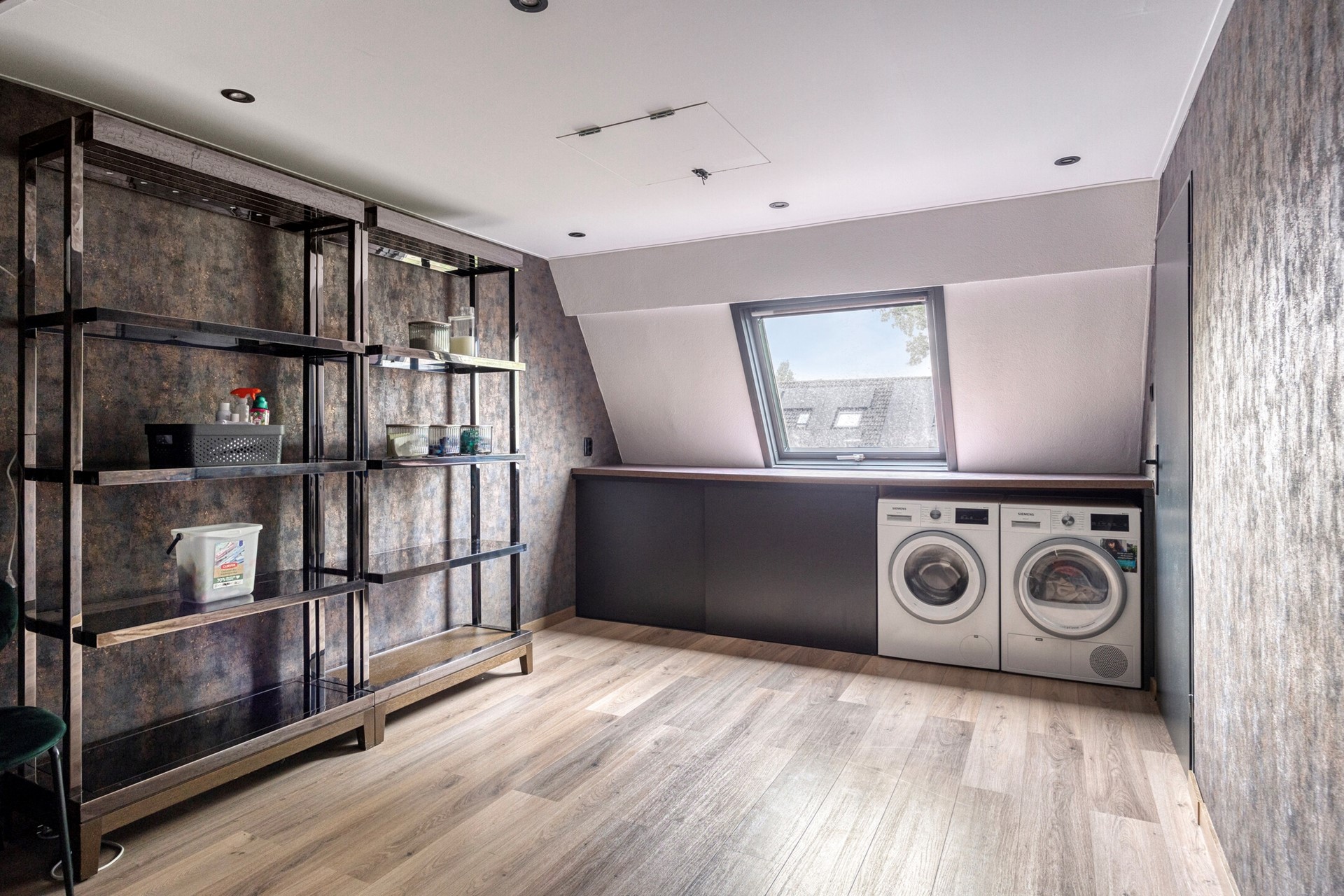 Deze ruime kamer is voorzien van een dakraam. Tevens vindt u hier de aansluitingen voor wasmachine en droger.