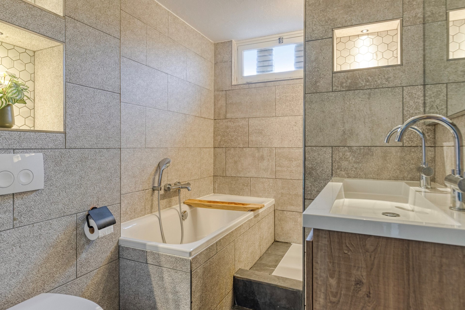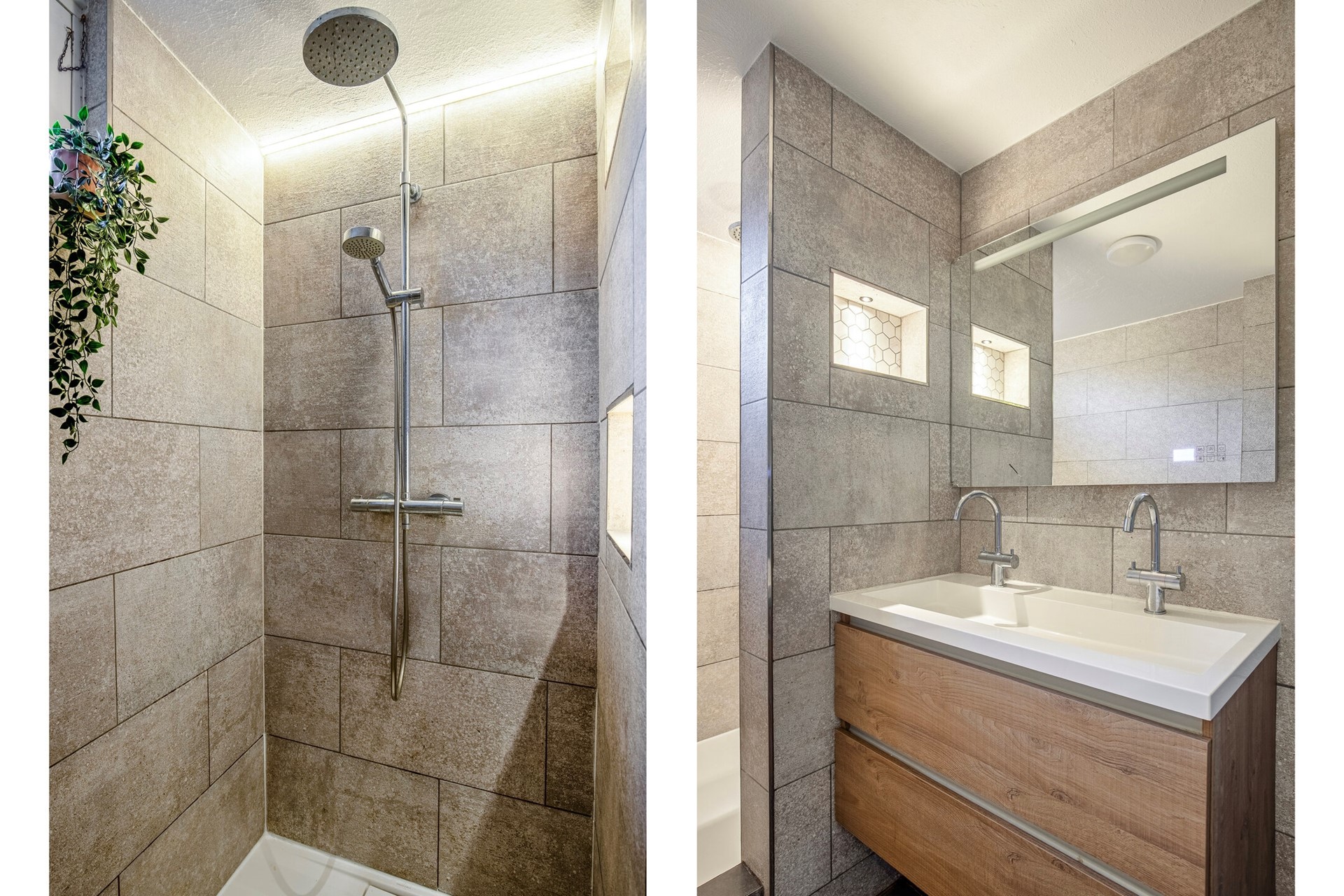 Ook de badkamer is modern afgewerkt en helemaal van nu. Een plek waar je de dag ontspannen begint en afsluit.