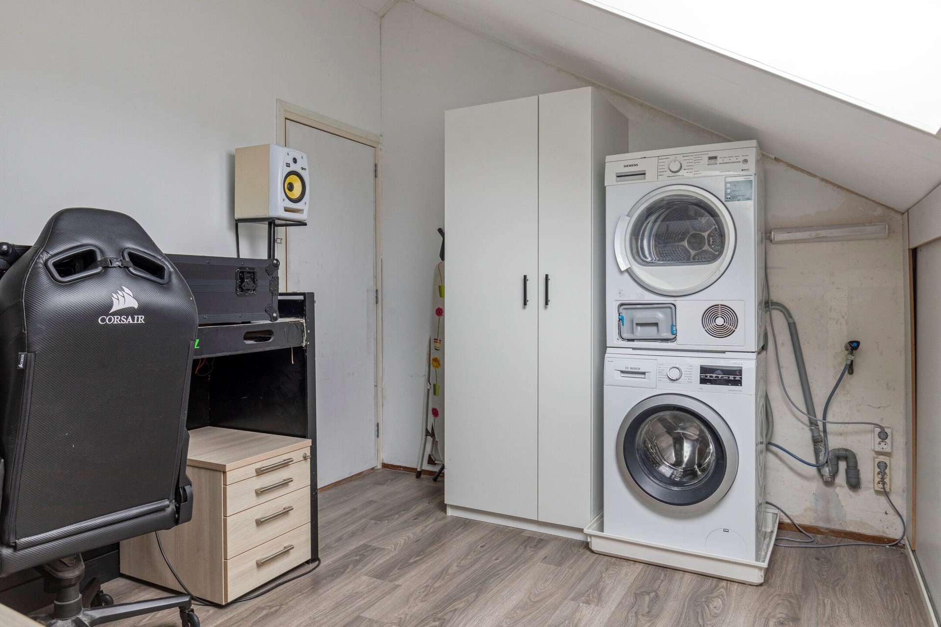 WASRUIMTE / WERKKAMER Afgewerkt met laminaatvloer, dakvenster en aansluiting wasapparatuur. Bergruimte achter de knieschotten.