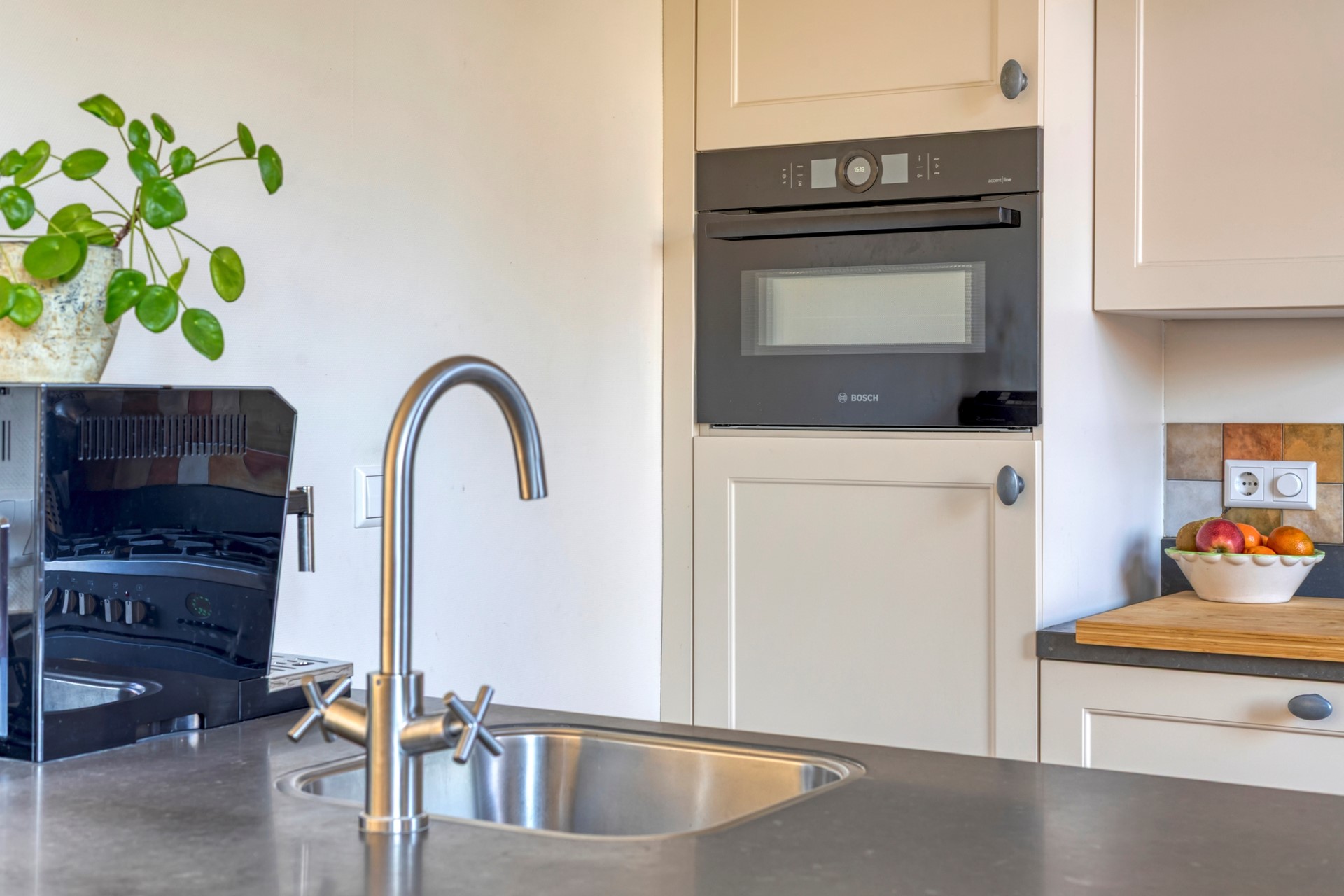 De half open keuken vormt een mooi geheel met de woonkamer en is uitgevoerd in een moderne, maar sfeervolle stijl. Hier kook je met plezier, terwijl je door het schiereiland ook in contact blijft met de rest van het gezin of je gasten.