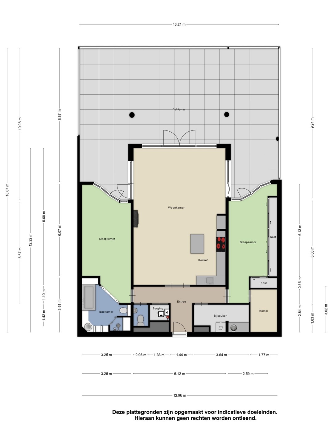 Dit appartement is voorzien van een riant balkon van ca. 100 m². Dit balkon is bereikbaar vanuit de woonkamer en beide slaapkamers.