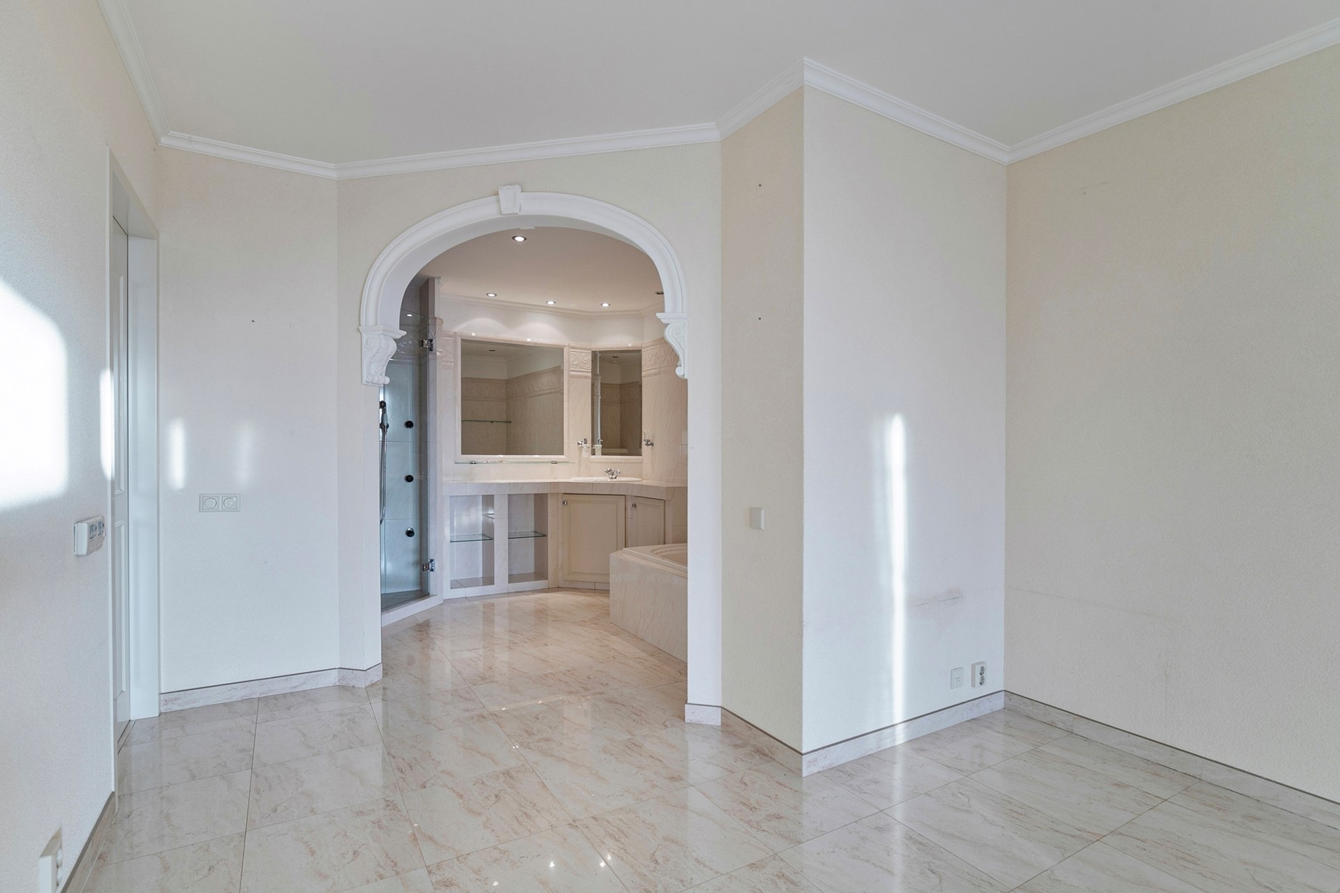 Slaapkamer 1: Ruime slaapkamer v.v. badkamer en suite en deur naar het terras.