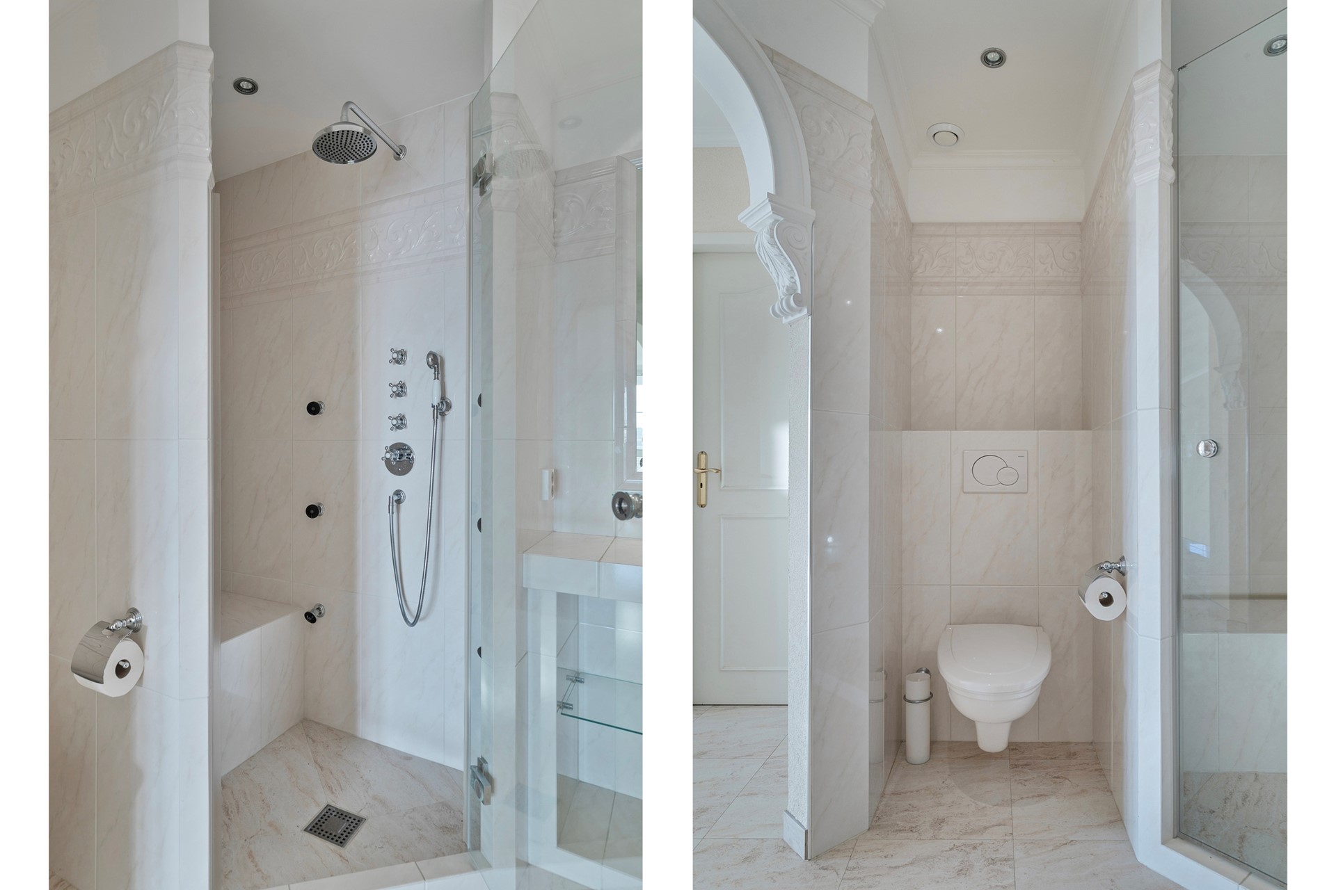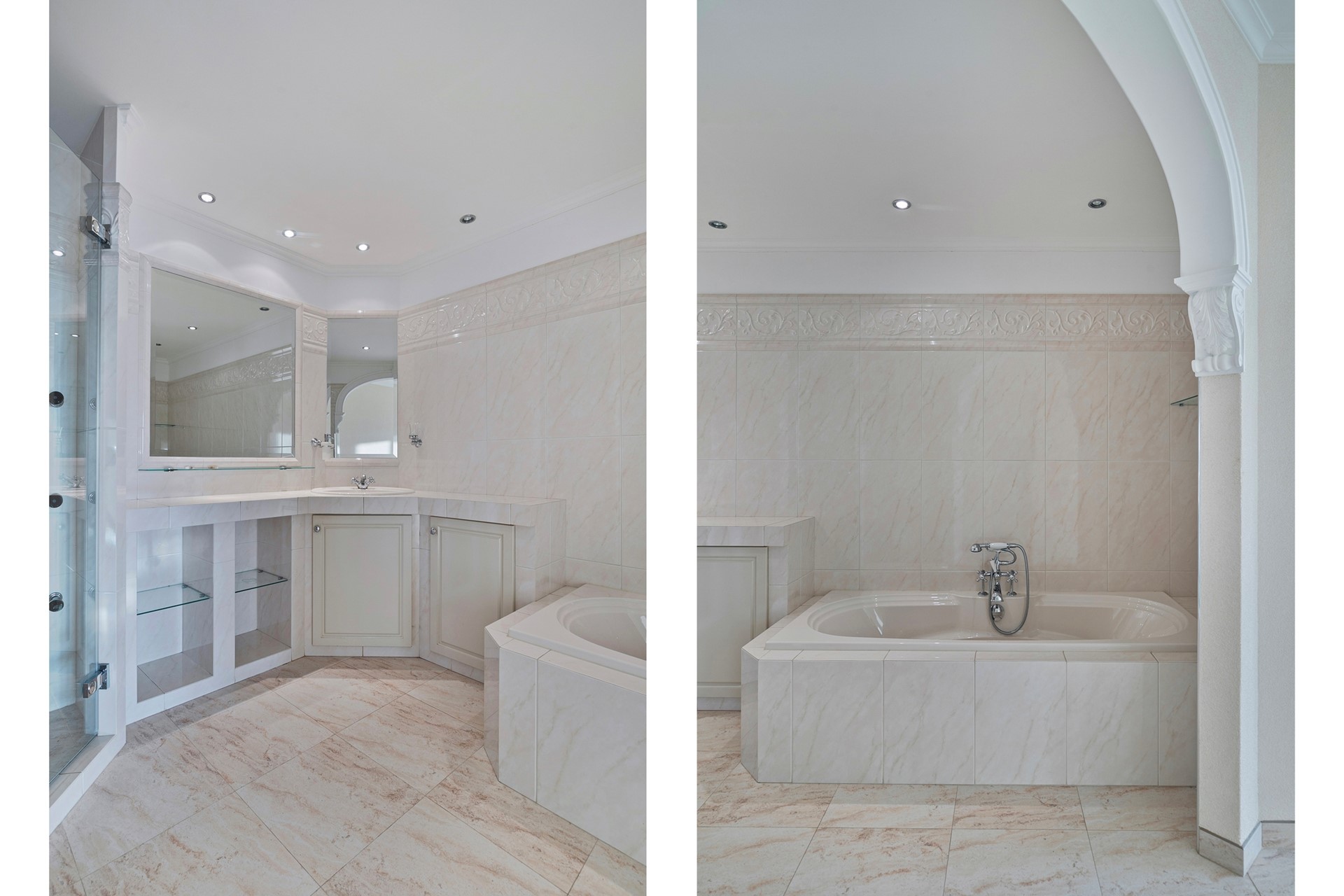 Badkamer: Luxe badkamer v.v. ligbad, douchecabine, wastafel meubel en toilet.