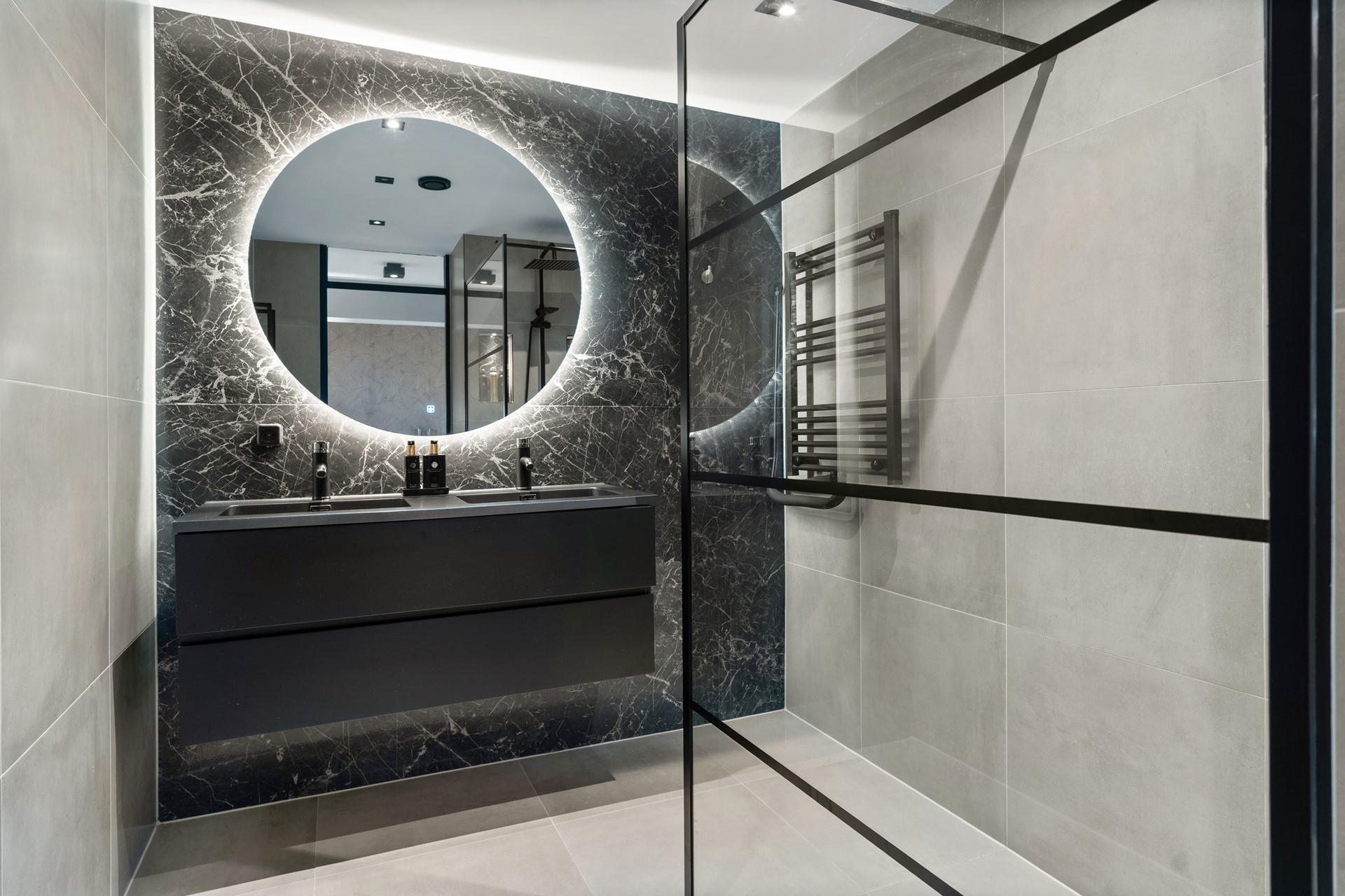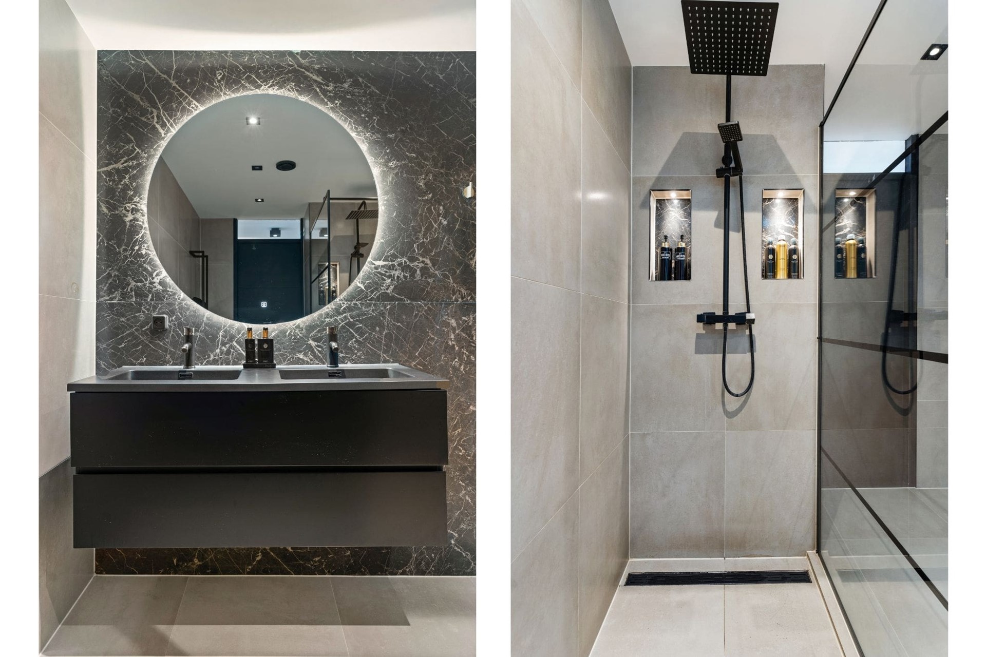 Luxe uitgevoerde badkamer met grote inloopdouche en badmeubel met dubbele wastafel.