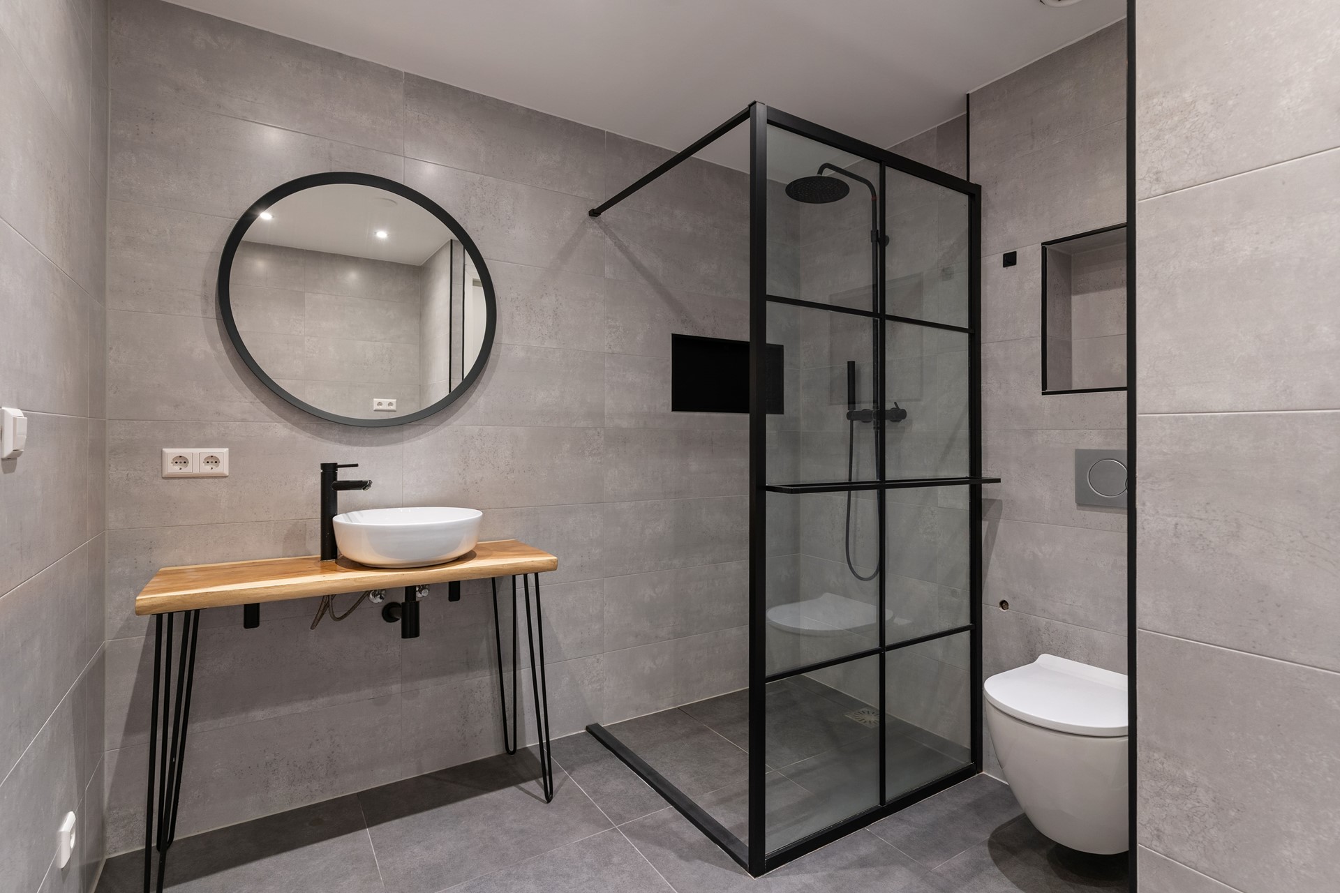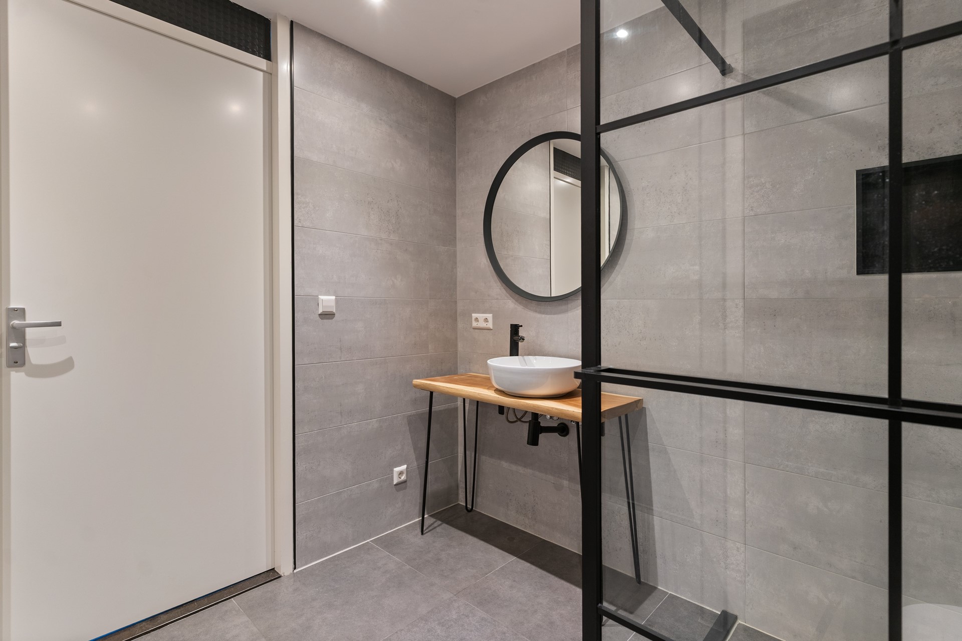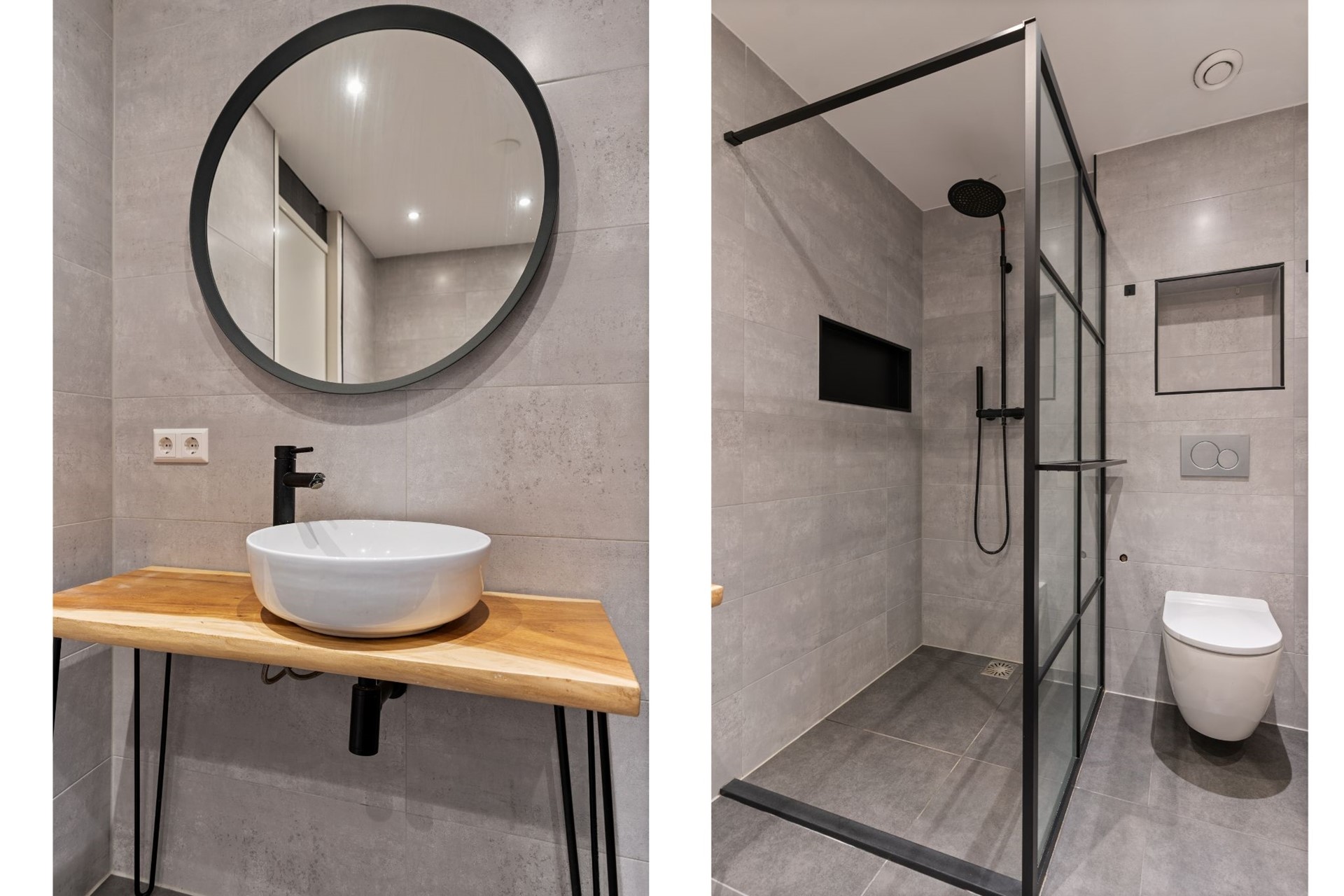 BADKAMER Luxe uitgevoerde badkamer met inloopdouche, hangend toilet, wastafelmeubel en aansluiting wasapparatuur.