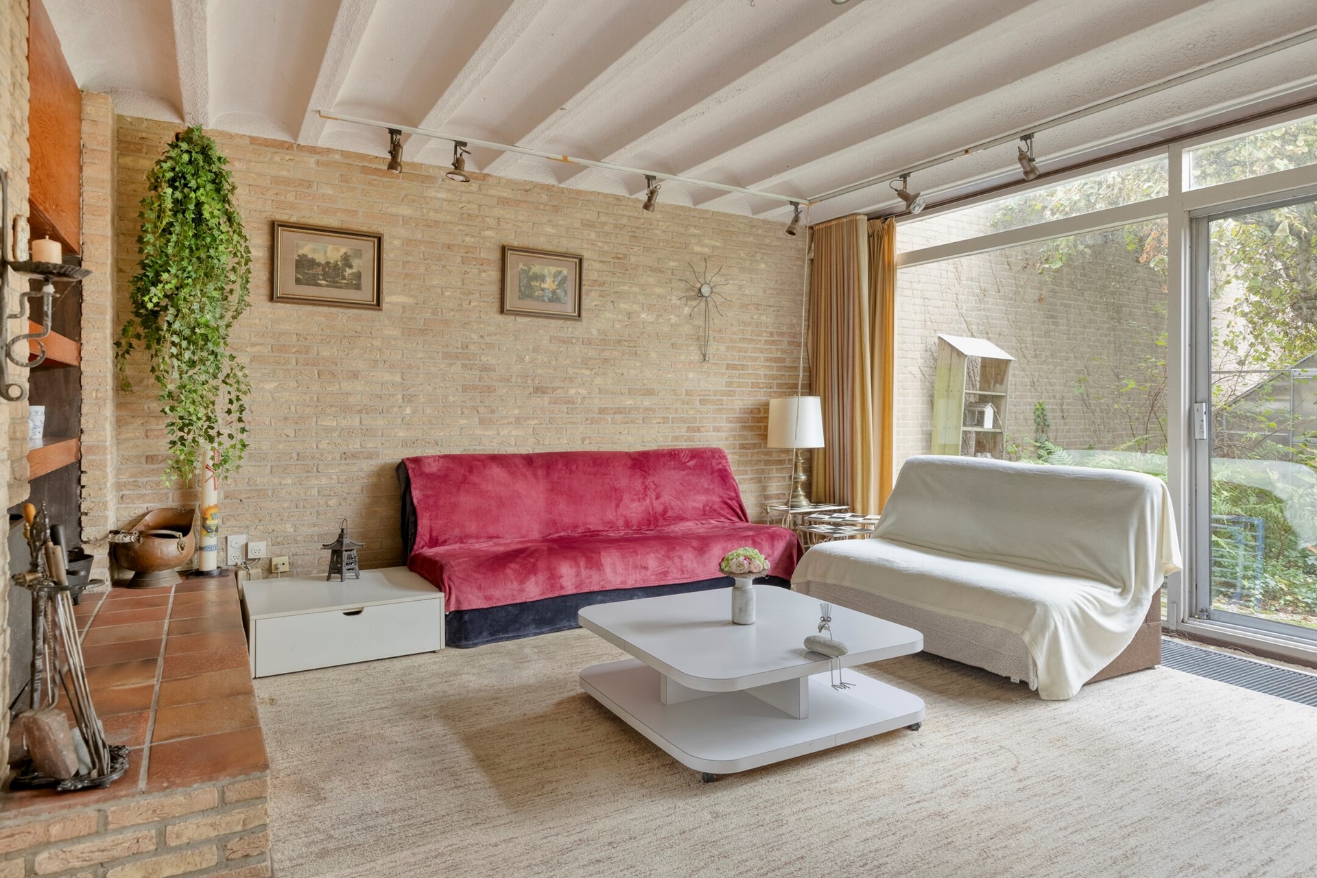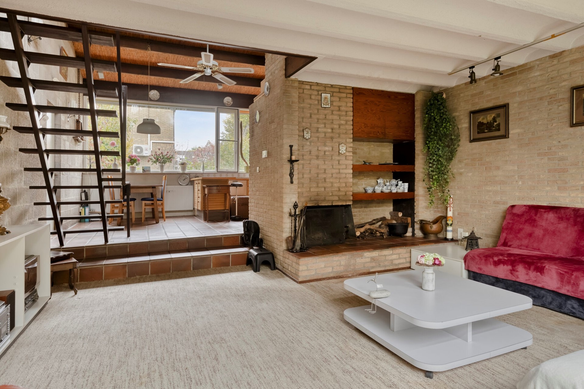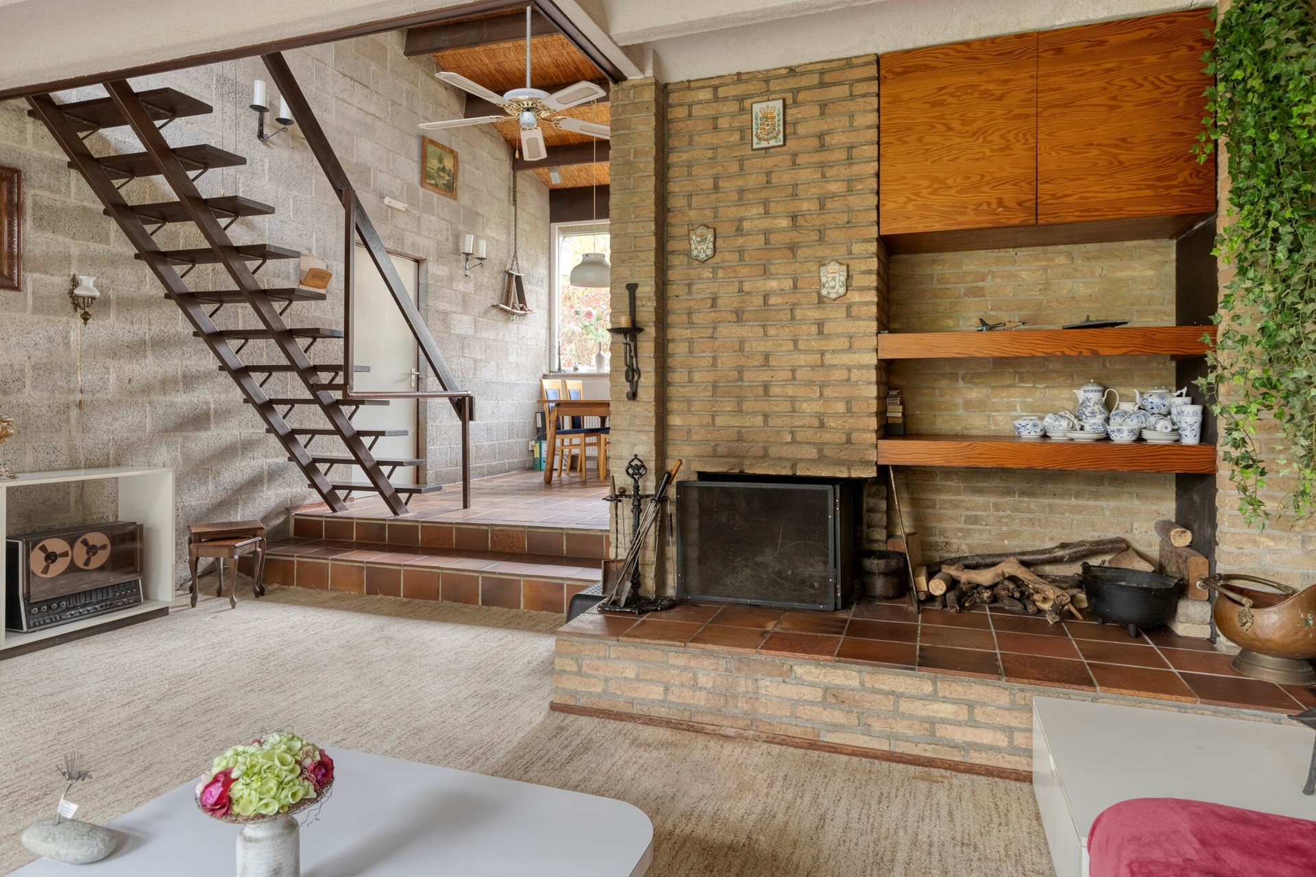 Woonkamer: Verdiept gelegen zitkamer voorzien van openhaard en schuifpui naar de tuin.