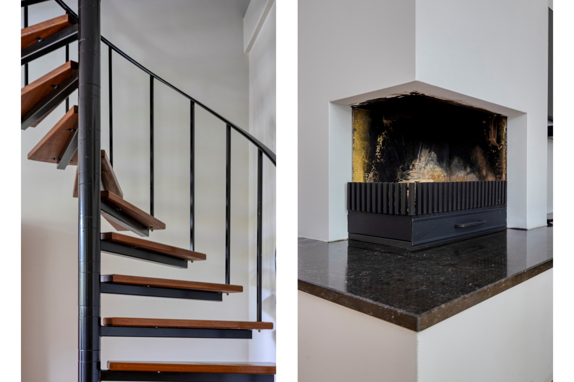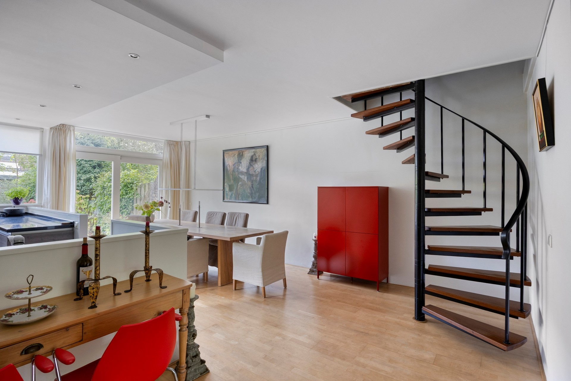 Met trap naar de verdieping, essen parketvloer, open haard (gas).