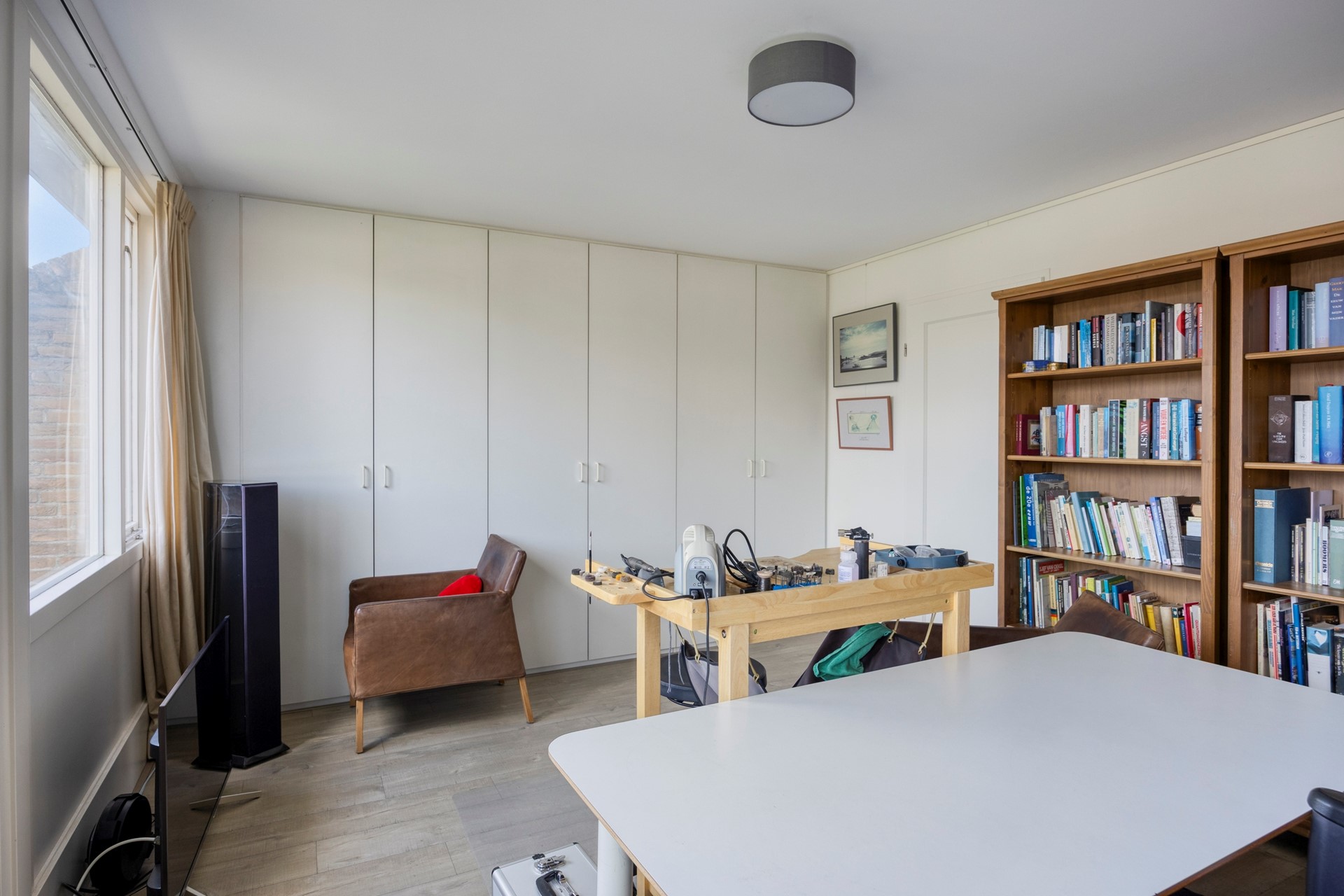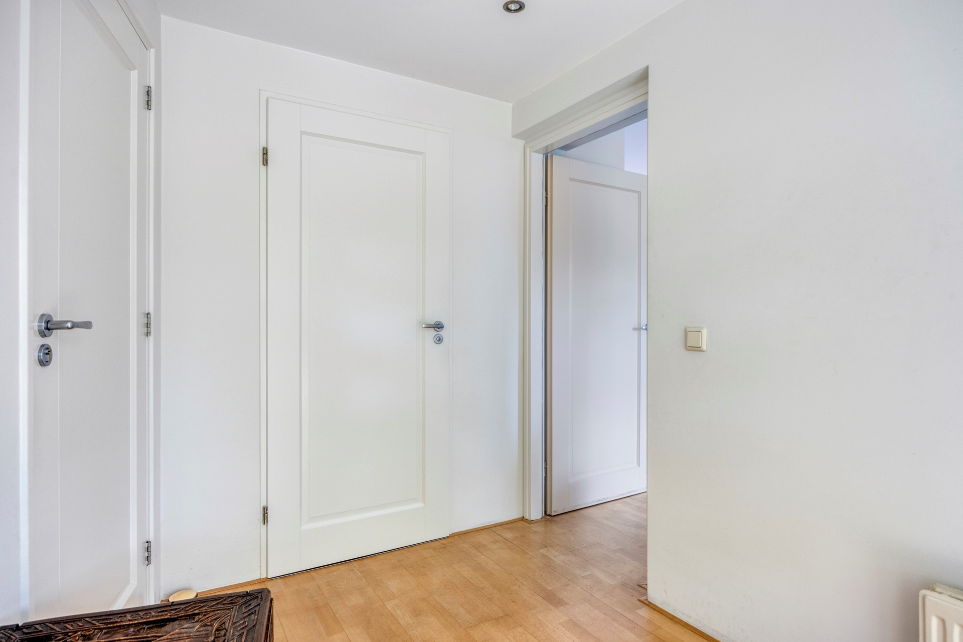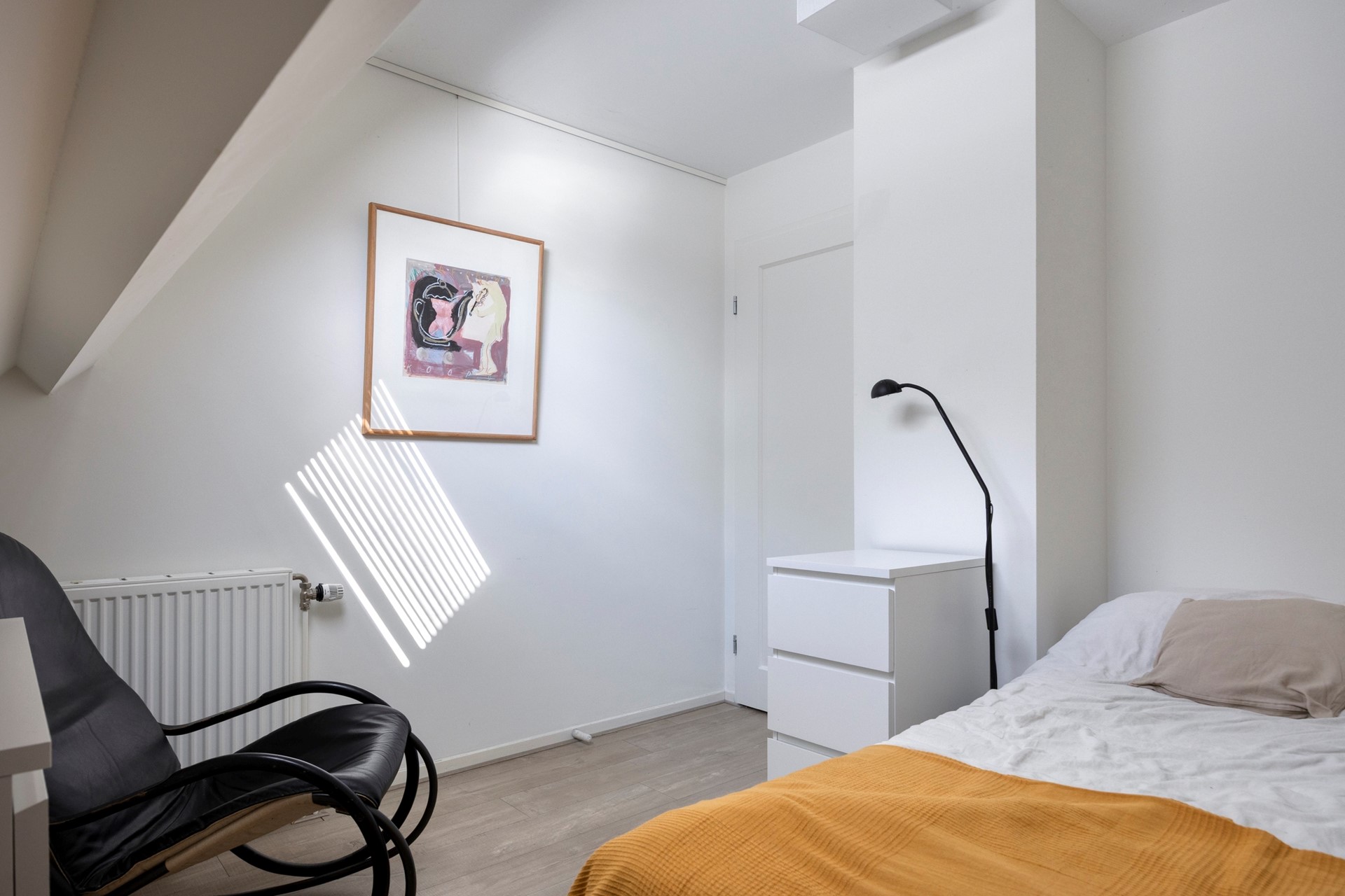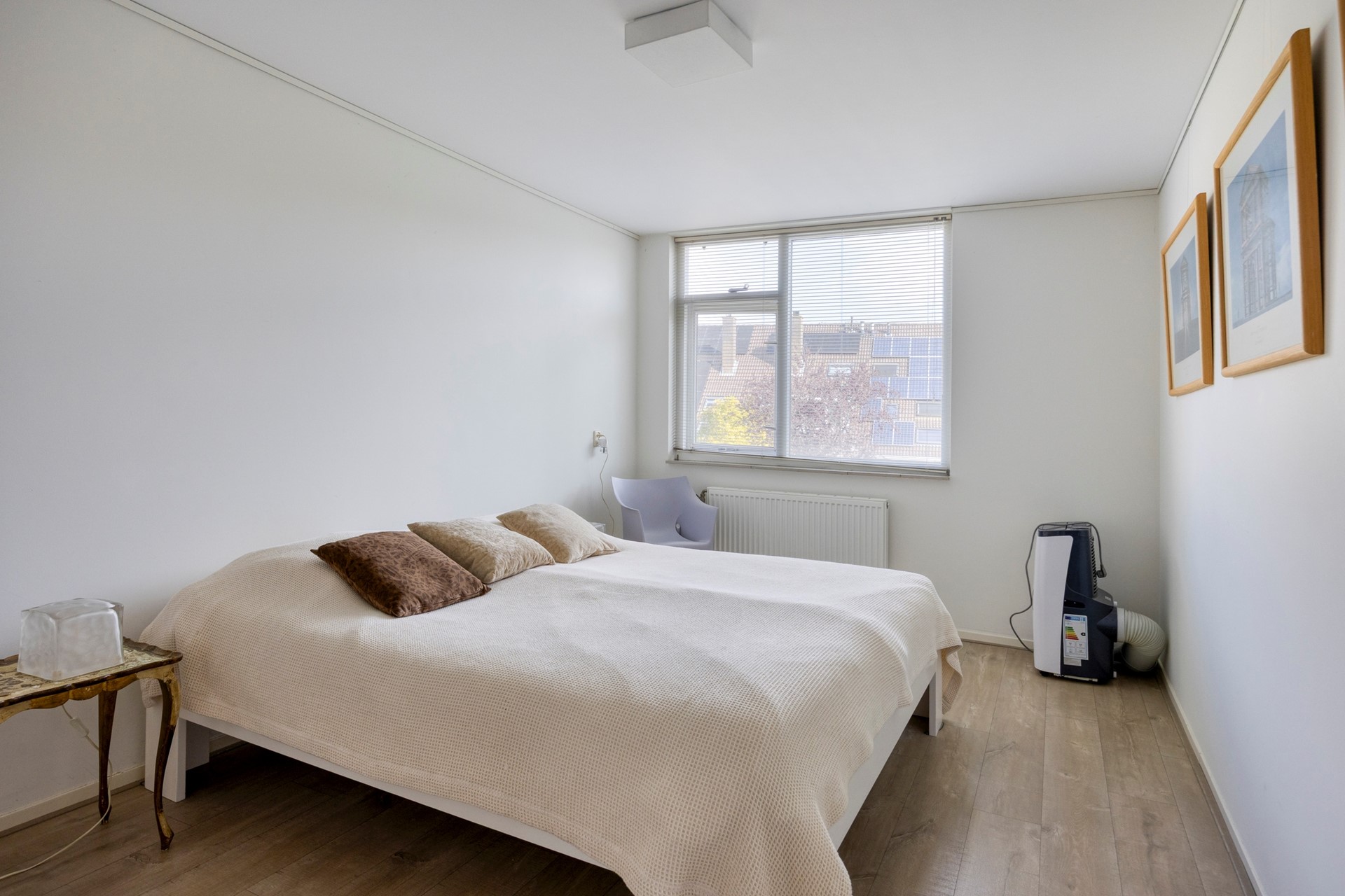 Ruime slaapkamer aan de achterzijde met laminaatvloer afwerking, kastenwand en deur naar het dakterras.