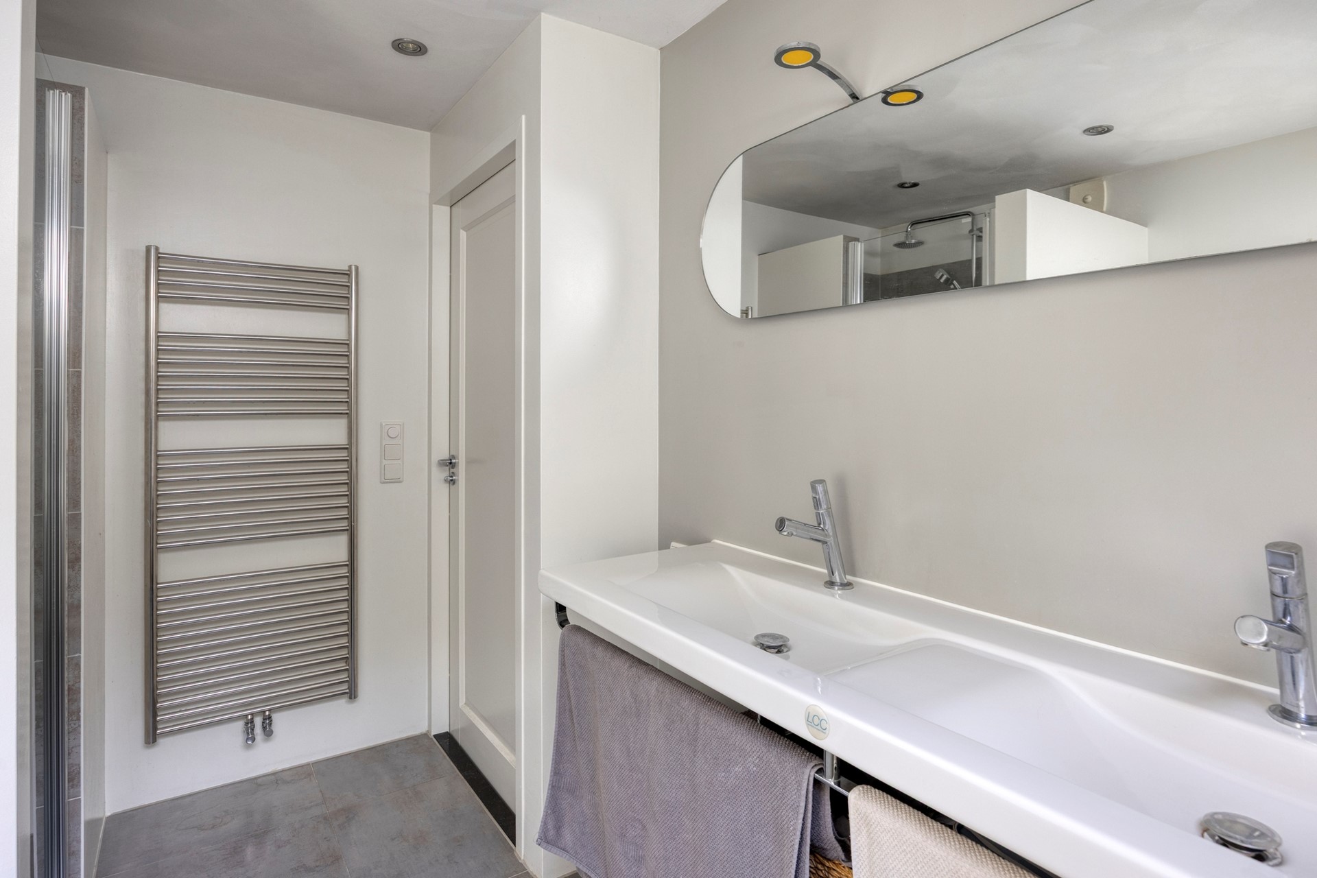 Moderne badkamer met ligbad, douchecabine en dubbele wastafel.